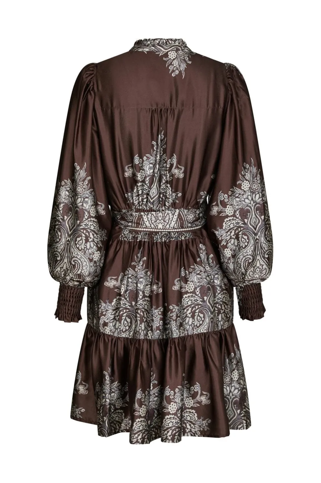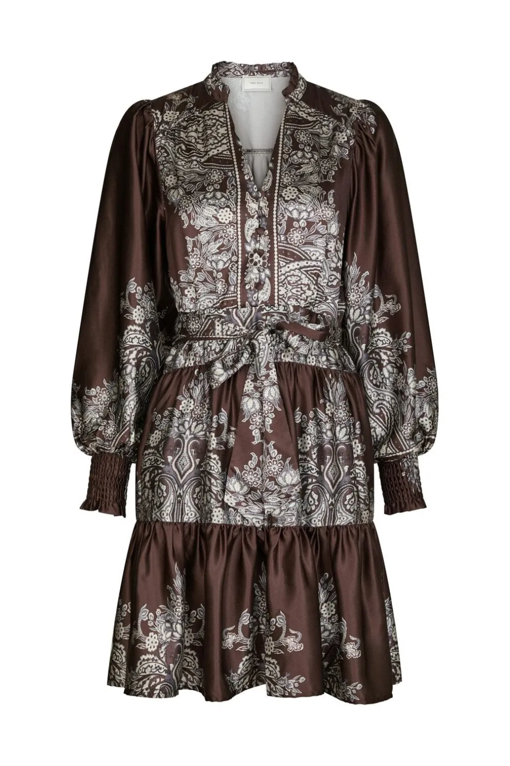 Mørkebrun kjole fra Neo Noir med paisleymønster i lyse nuancer. Kjolen har knapper foran, høj hals og lange ærmer med rynkede manchetter. Bindebåndet i taljen skaber form.