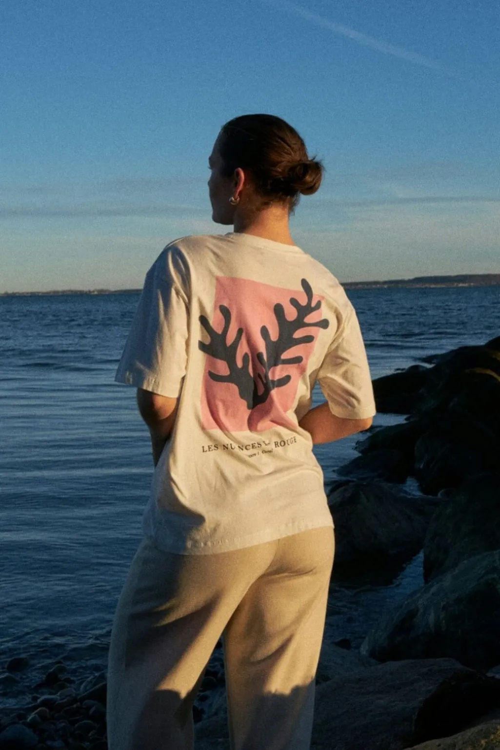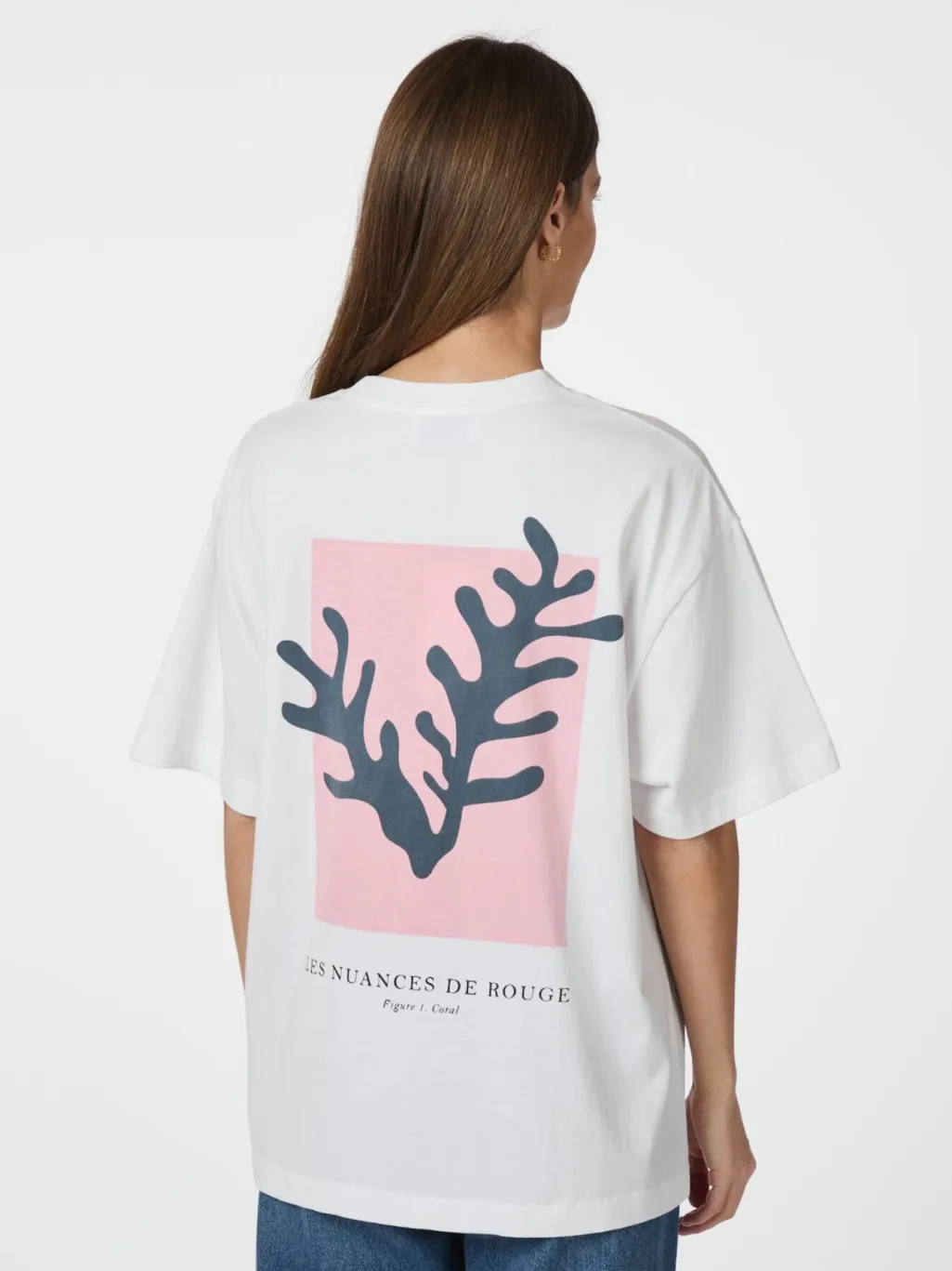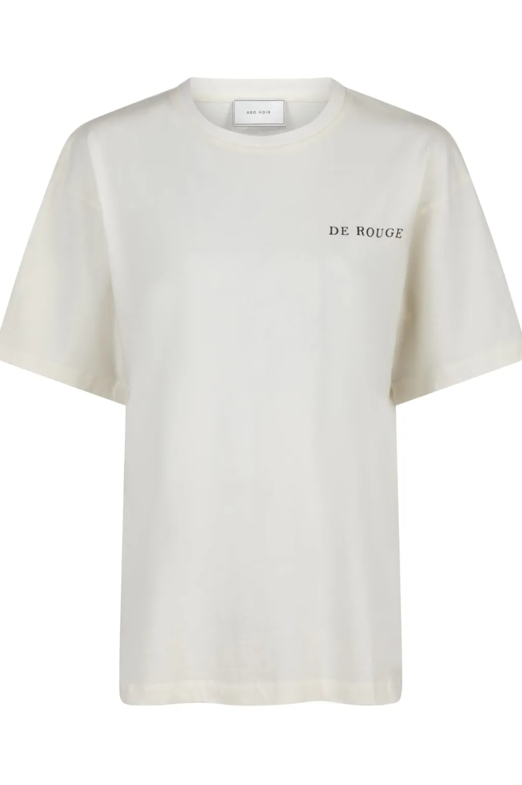 T-shirt fra Neo Noir i rosefarvet nuance. På forsiden ses teksten DE ROUGE, mens bagsiden har et sort koraldesign på pink baggrund. Den runde halsudskæring og de korte ærmer giver en klassisk t-shirt-form.