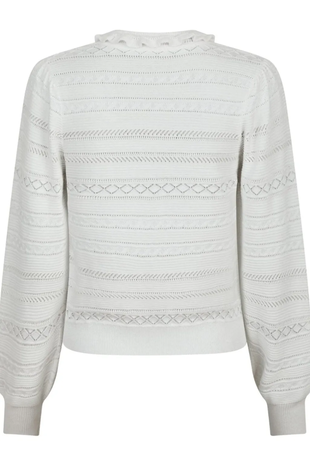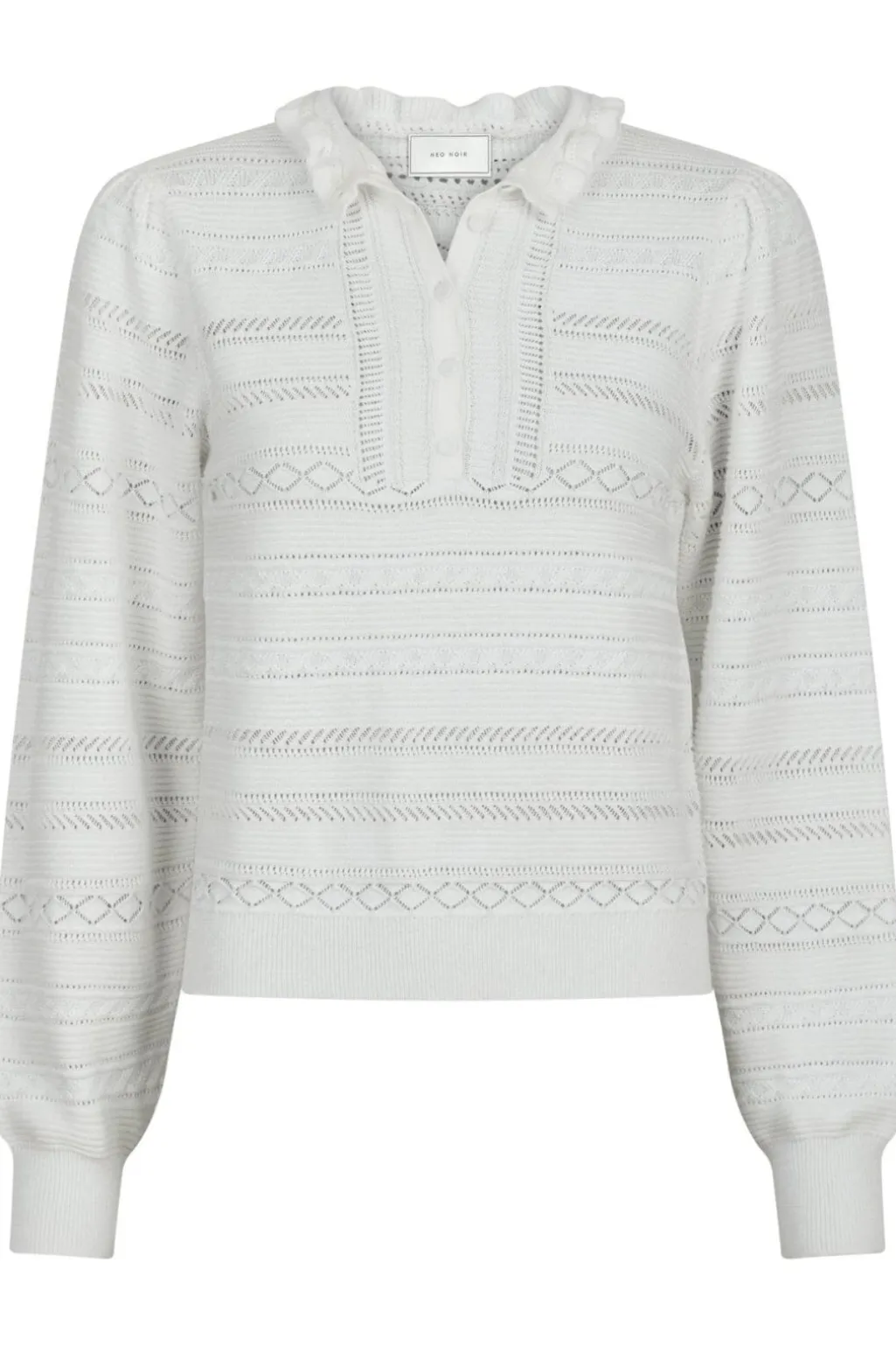 Hvid strikbluse fra Neo Noir med mønster. Blusen har et strikket design med vandrette og diamantformede mønstre samt flæsedetaljer ved polokraven.