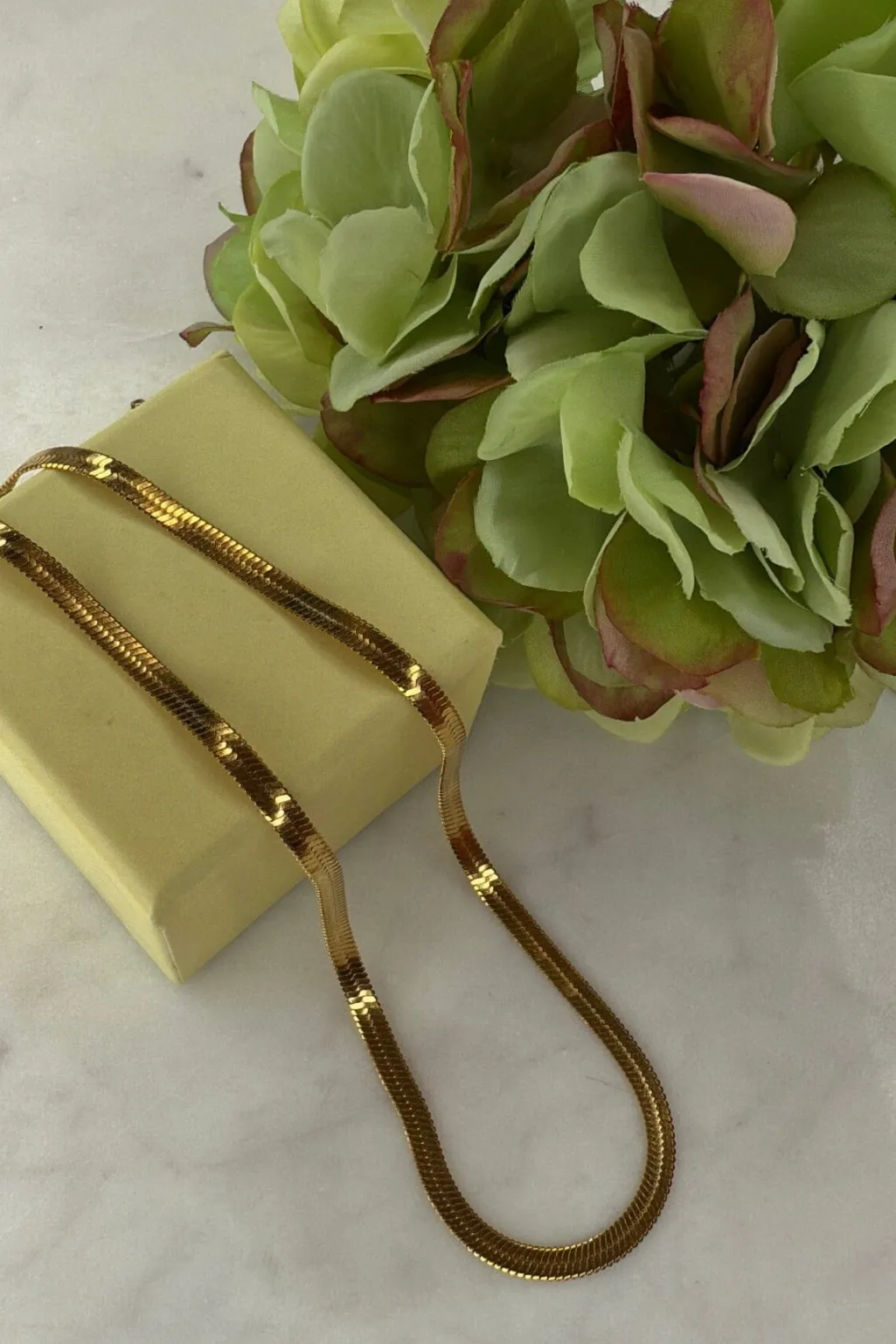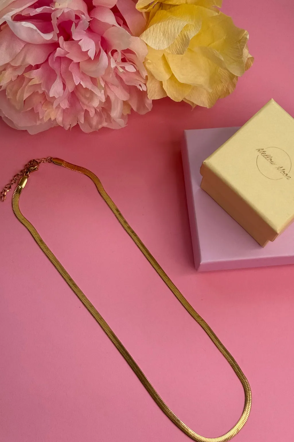 Forgyldt halskæde fra Mellow Moon med en slangeagtig kæde. Den gyldne overflade giver smykket et blankt udseende, og kæden passer til både festlige og formelle anledninger.