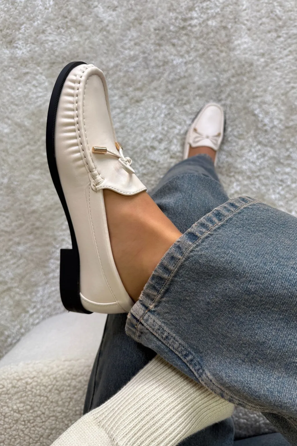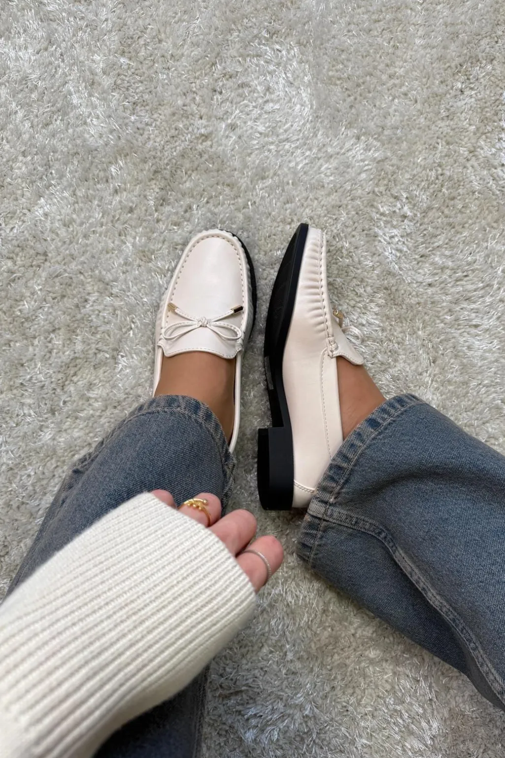 Beige sko fra Bloom med rund tå og dekorativ sløjfe. Skoene har en lav hæl og er lavet i syntetisk materiale med en enkel stil, der passer til hverdagens mange gøremål.
