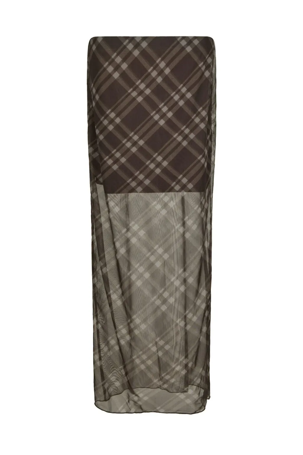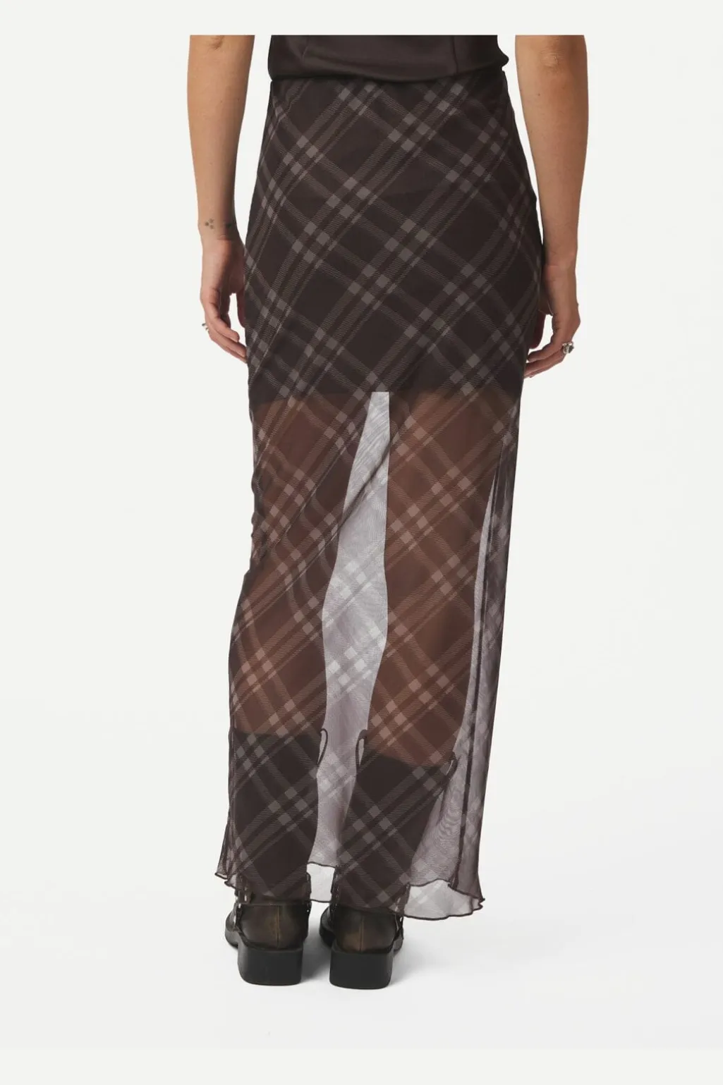 Ternet nederdel fra Neo Noir i mørkebrun med mesh-lag. Nederdelen har et delvist gennemsigtigt udseende i toppen og et kortere foer indeni.