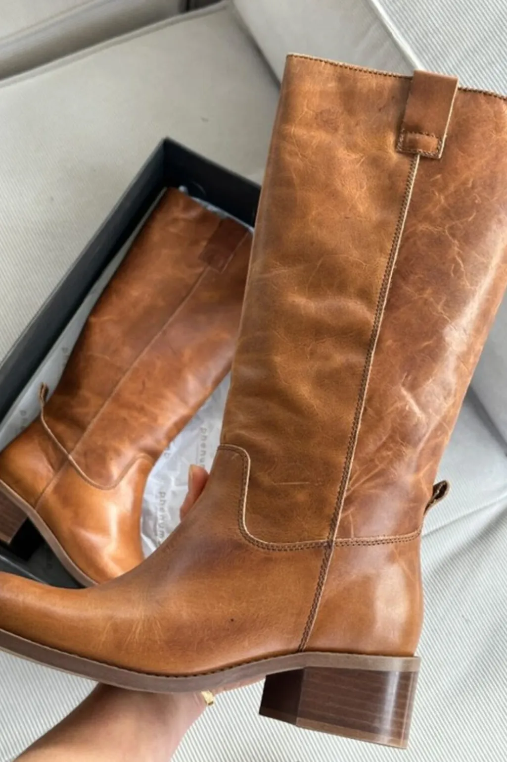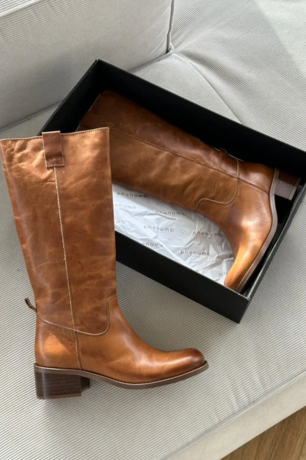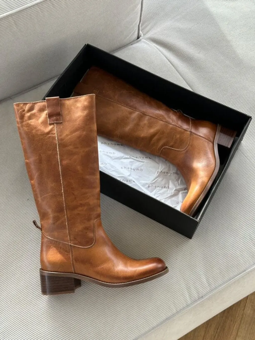 Lange støvler fra Phenumb Copenhagen i poleret cognacfarvet læder. Støvlerne har høj skaft og en stabil blokhæl, der er mindre end 5 cm.