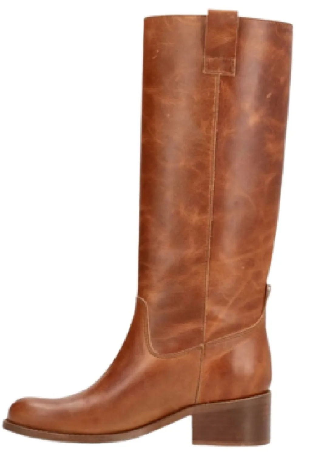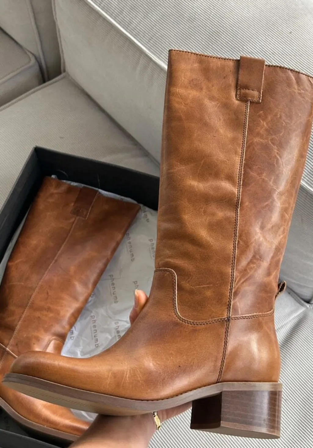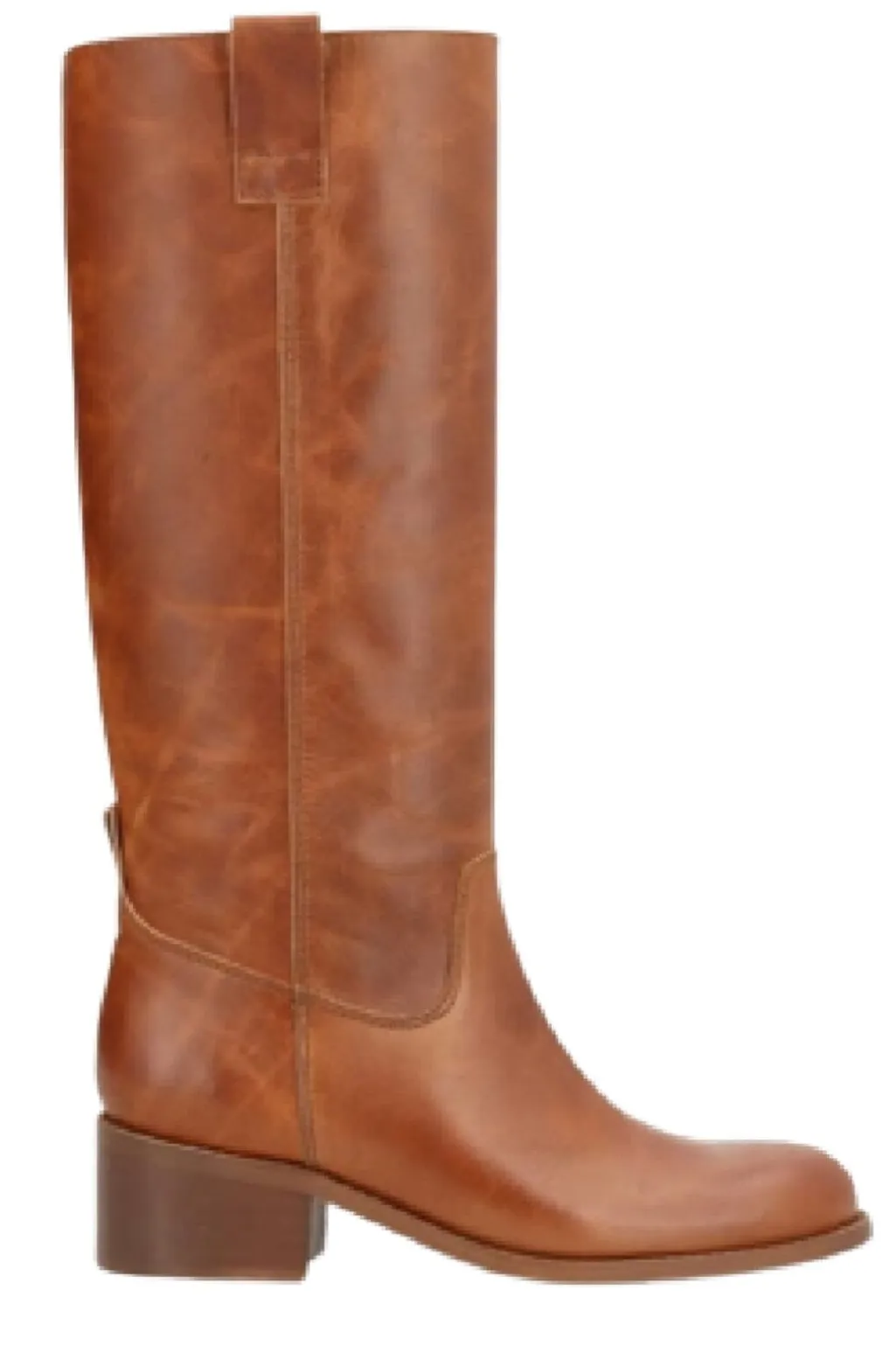 Lange støvler fra Phenumb Copenhagen i poleret cognacfarvet læder. Støvlerne har høj skaft og en stabil blokhæl, der er mindre end 5 cm.