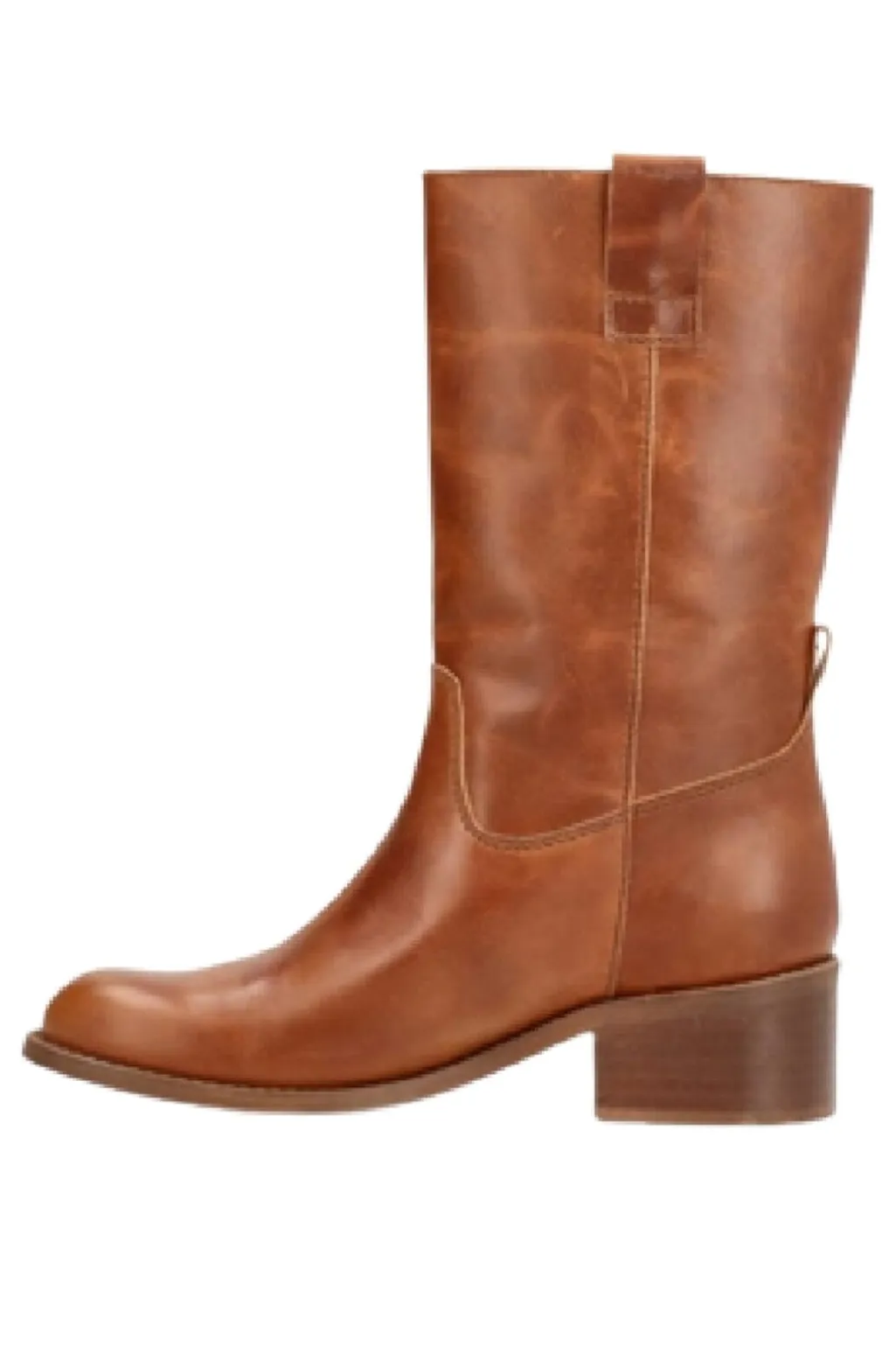 Læderstøvler i en varm cognacfarve. Støvlerne har en glat overflade og en blokhæl, der giver god støtte under gang. Den mandelformede tå giver støvlerne et afrundet look.