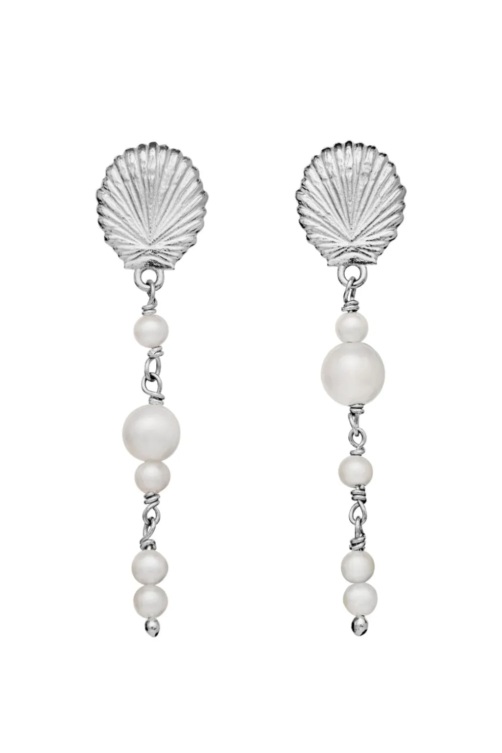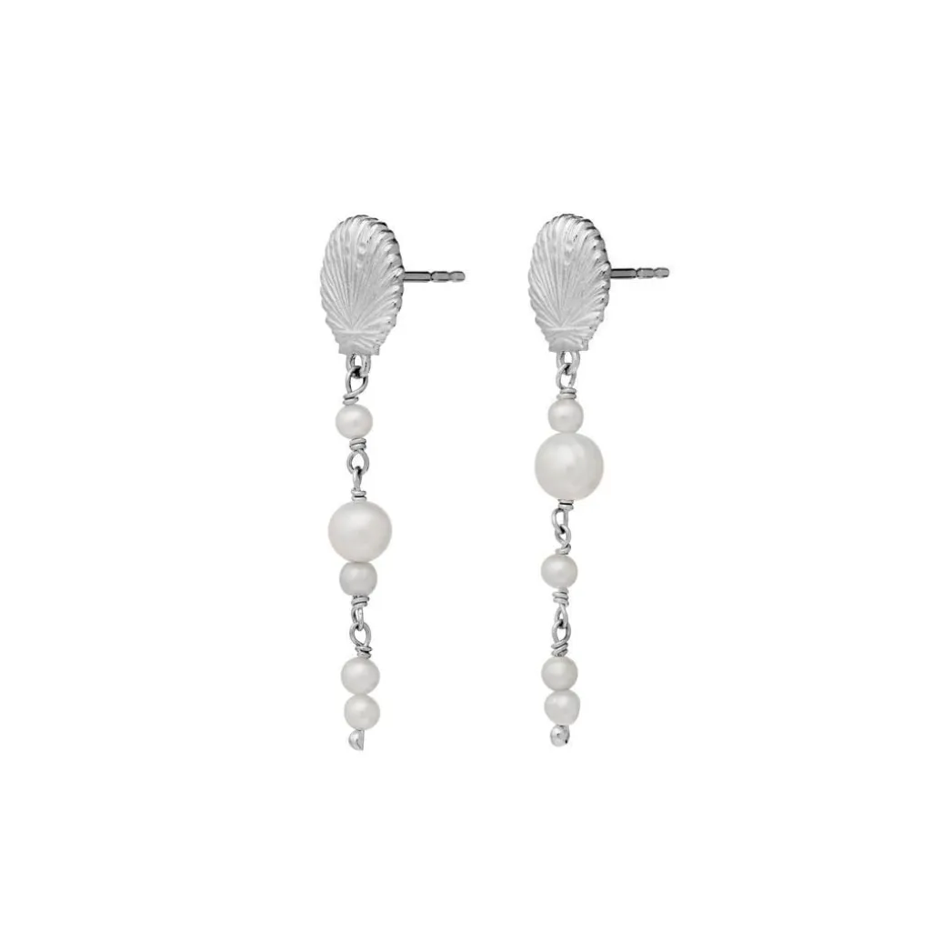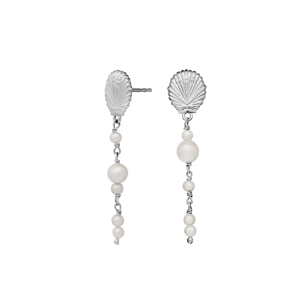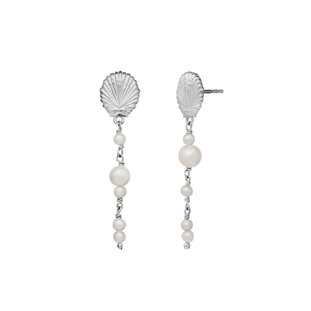 Sølvfarvede øreringe fra Maanesten med skaldformet top og hængende ferskvandsperler. Designet kombinerer hvide perler i forskellige størrelser med en karakteristisk muslingeskal.