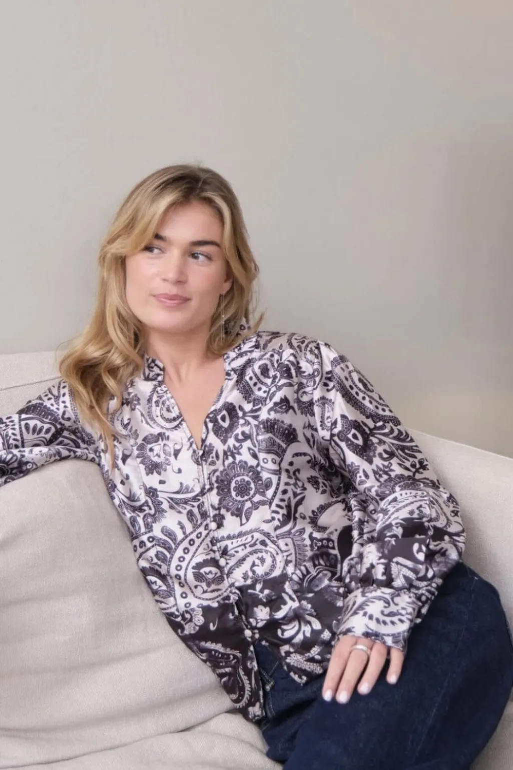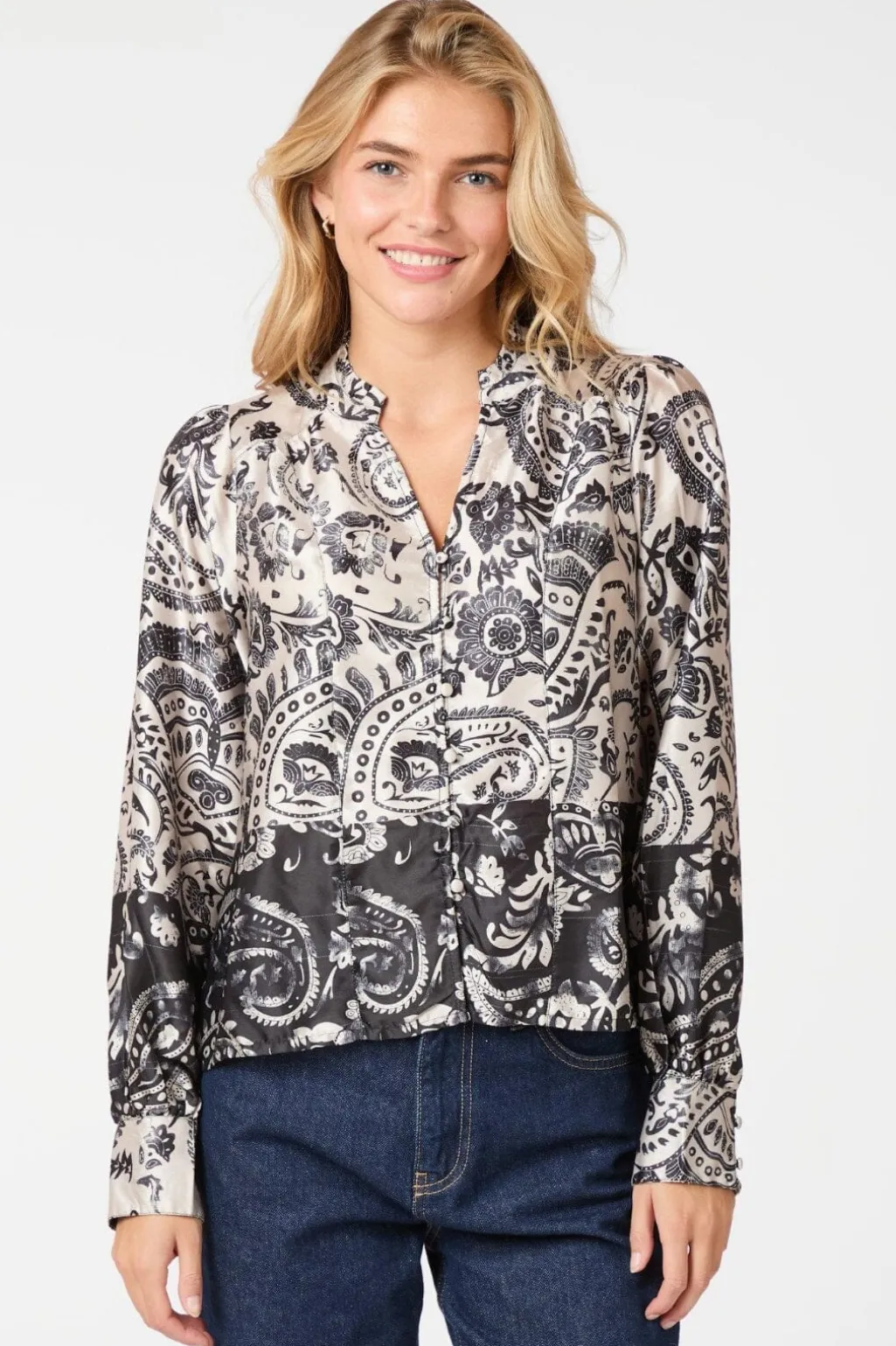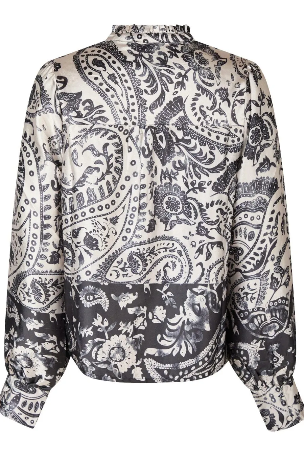 Cremefarvet bluse fra Neo Noir med sort og hvidt paisley-mønster. Blusen har V-udskæring, lange ærmer med manchetter og flæsedetaljer på forsiden.
