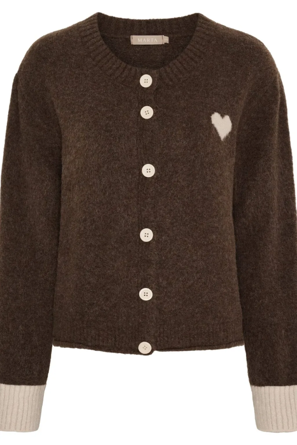 Brun striktrøje fra Marta Du Chateau med beige manchetter og knapper langs fronten. Et lille hjertemotiv sidder på venstre side af brystet.