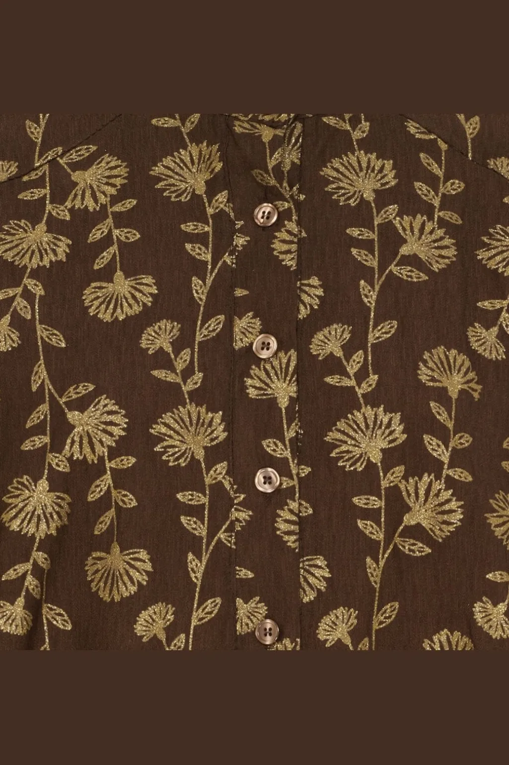 Brun kjole fra Marta Du Chateau med gyldent blomsterprint. Kjolen har knapper hele vejen ned, skjortekrave og lange ærmer med elastik ved håndleddene.