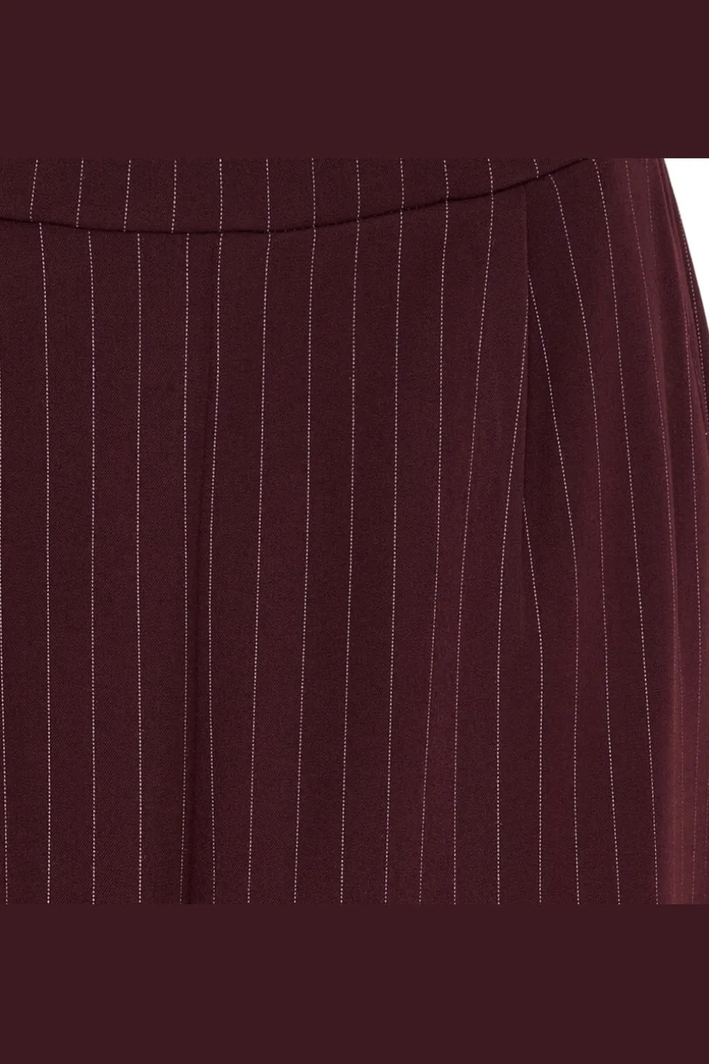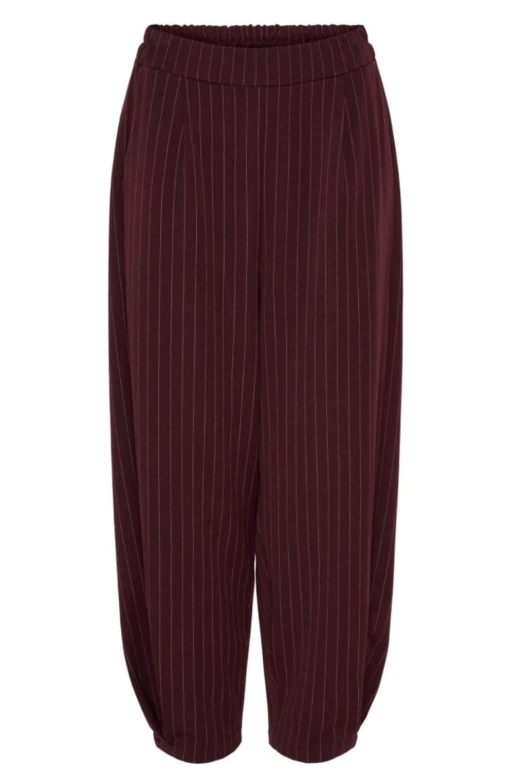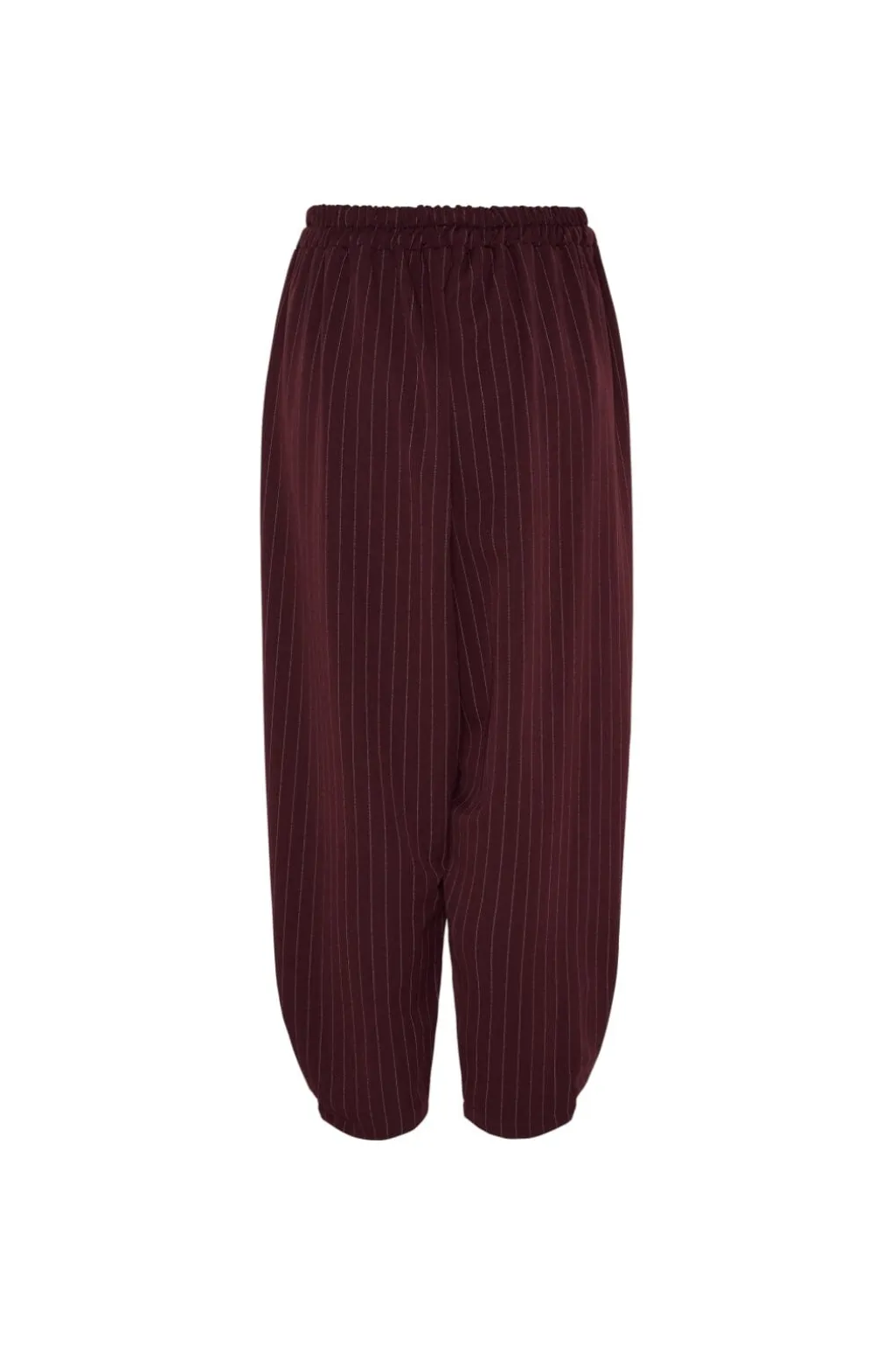 Bordeauxfarvede bukser fra Marta Du Château med et nålestribet mønster. Bukserne har en løs pasform og en elastisk talje.
