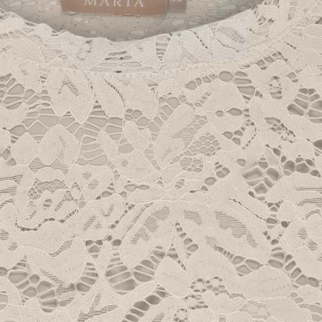 En beige blondebluse fra Marta Du Chateau med et blomstret mønster over hele overfladen og en bølget afslutning.