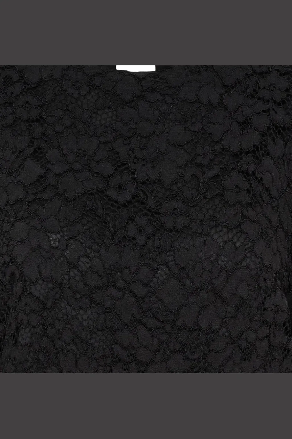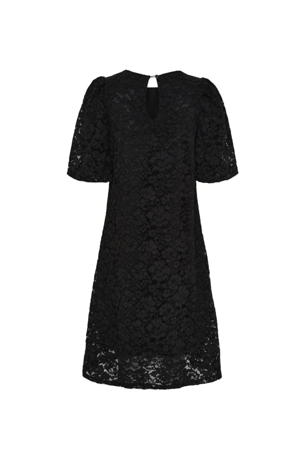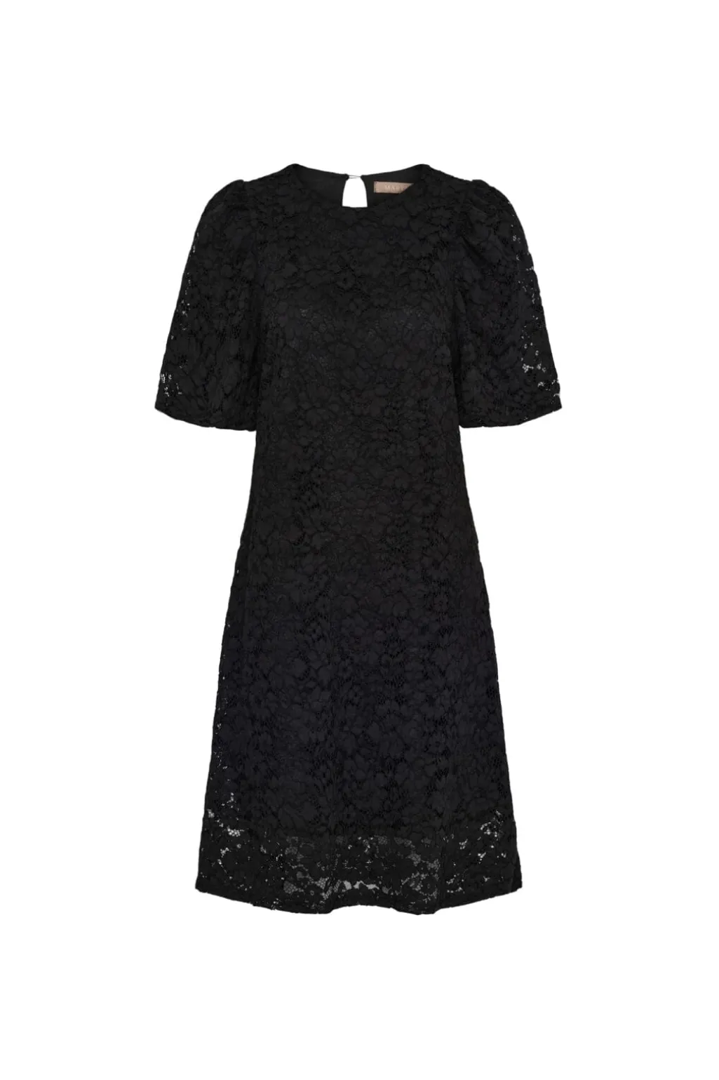 Sort knælang kjole fra Marta Du Chateau med blomsterblondemønster. Kjolen har puffede ærmer, rund hals og knaplukning i ryggen.