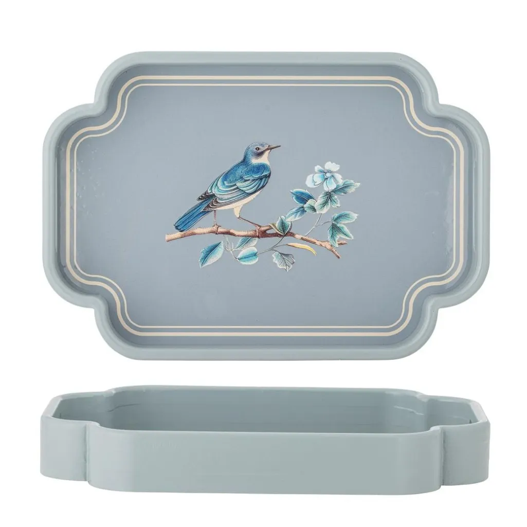 Blåt fad fra Bloomingville med et detaljeret motiv af en fugl på en blomstrende gren. Fadet er lavet af MDF og har afrundede hjørner.