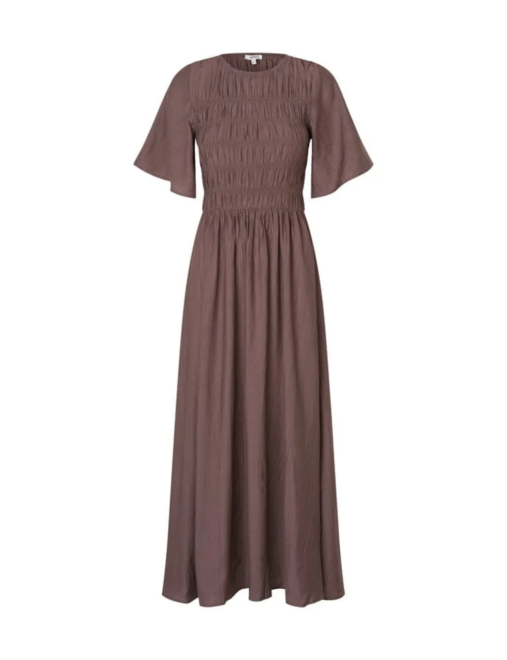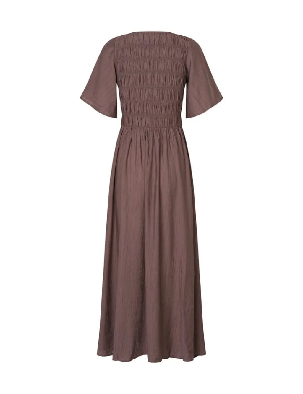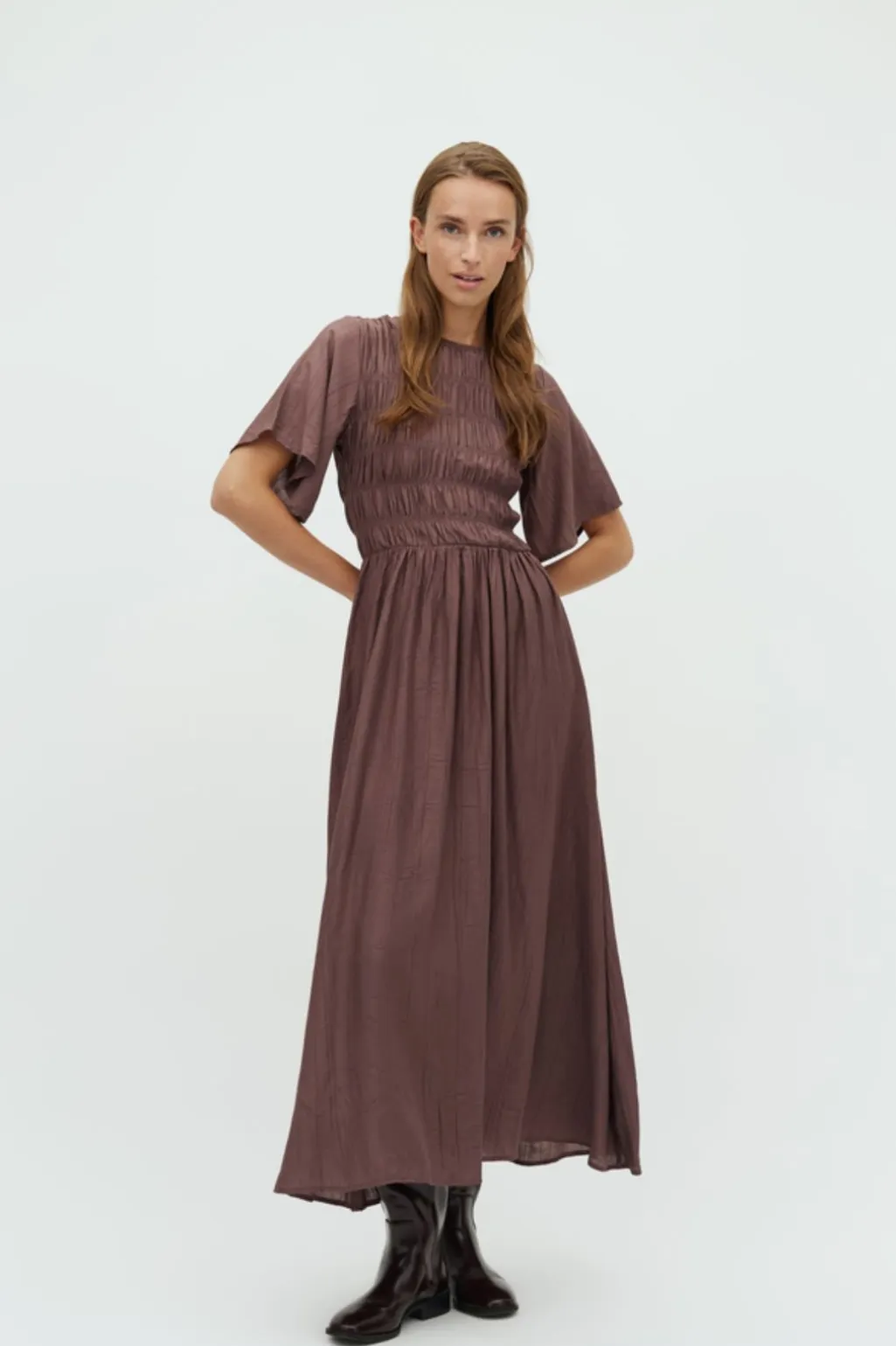 Lang kjole fra MbyM i brun-lilla. Kjolen har et smock-detaljeret livstykke og korte, vide ærmer.