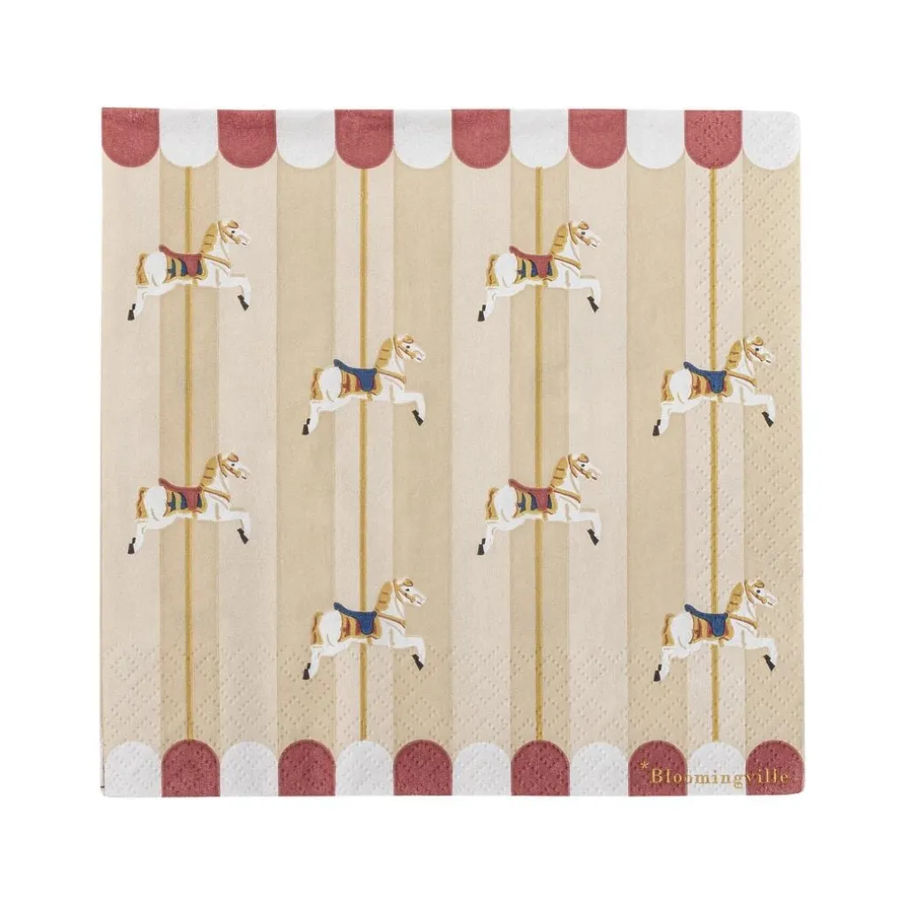 Merry-go-round servietterne fra Bloomingville kommer i en pakke med 20 smukke papirsservietter, prydet med forskellige karruselmotiver. Disse servietter tilføjer et legende og nostalgisk touch til julebordet eller andre festlige lejligheder og skaber en hyggelig atmosfære.
