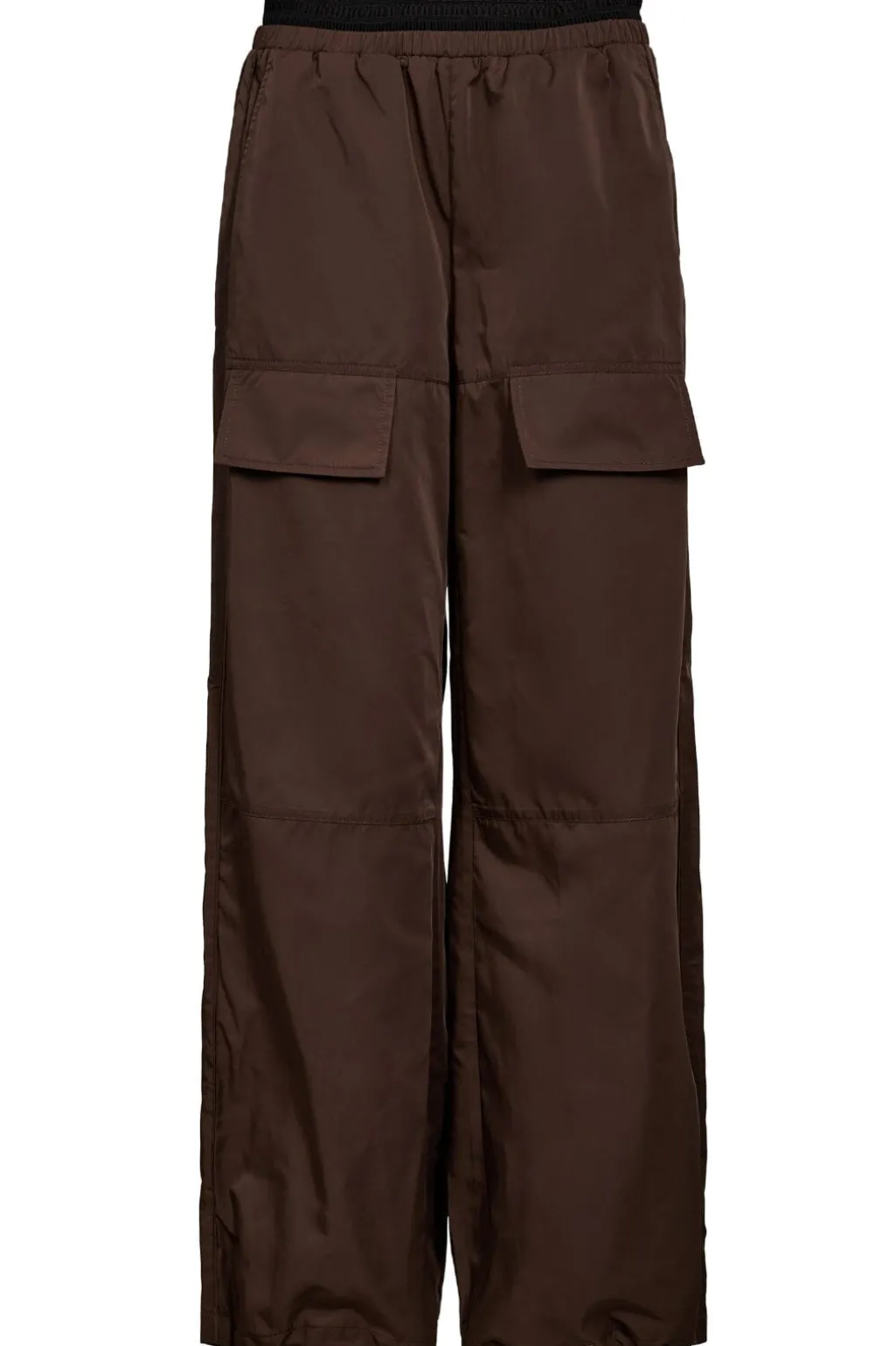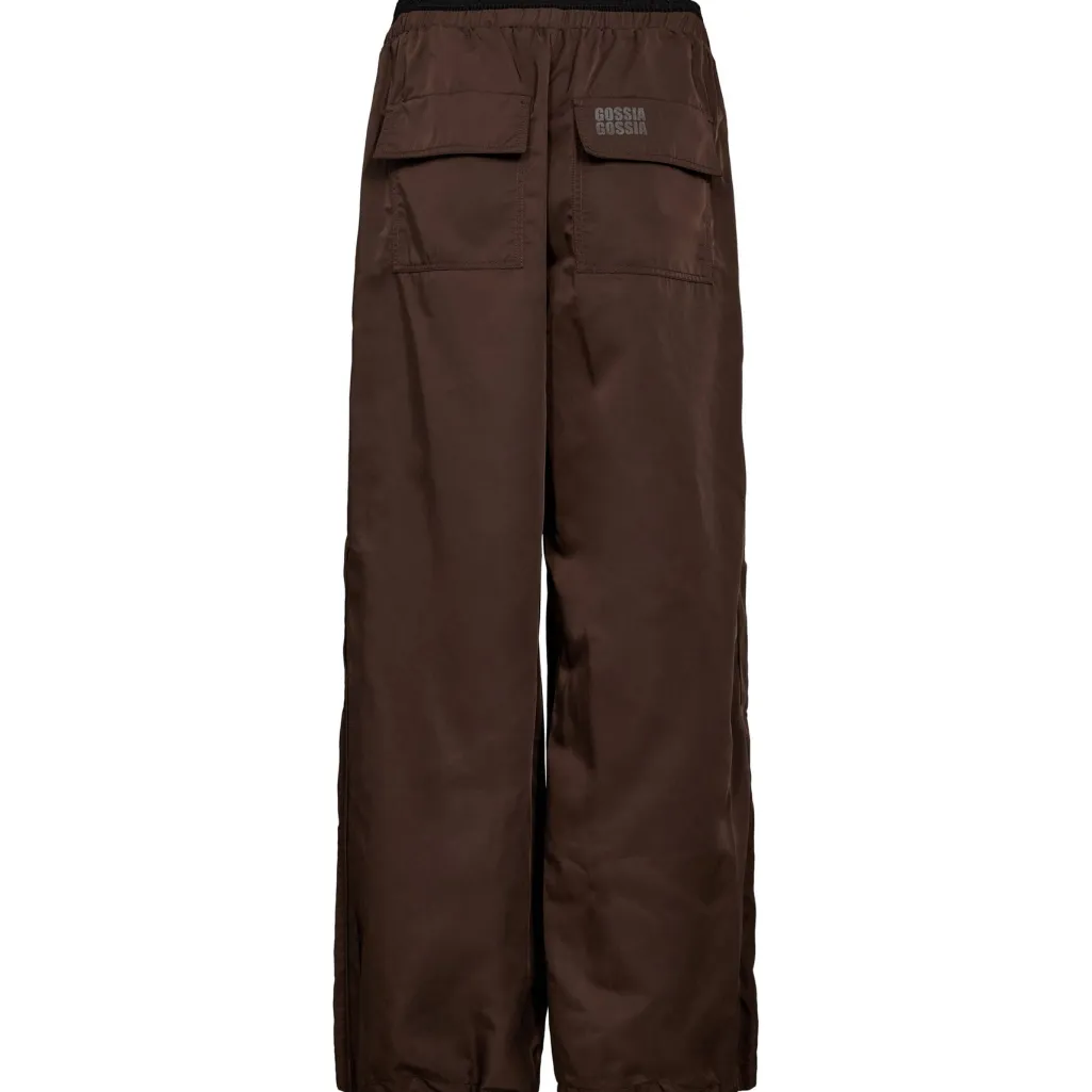 Brune bukser fra Gossia, lavet af 100 % polyester. Bukserne har en løs pasform og en elastisk talje med snøre.
