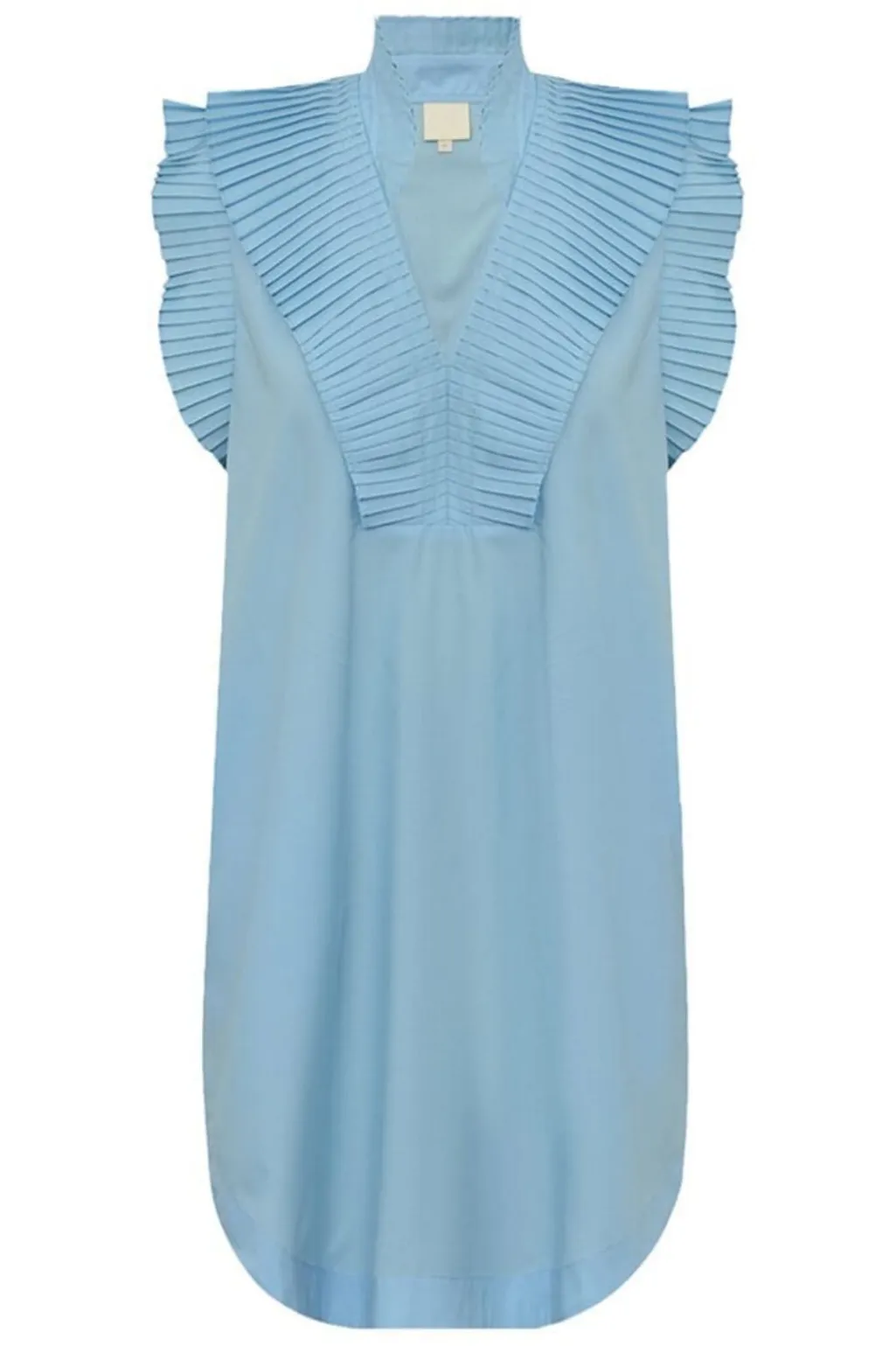 Isblå kjole fra Gossia med A-formet silhuet. Kjolen har plisserede flæser ved kraven og skuldrene samt en dyb V-udskæring.