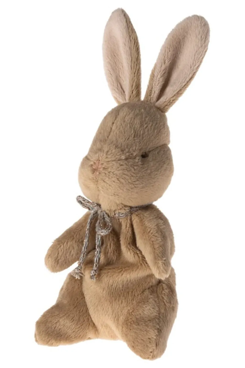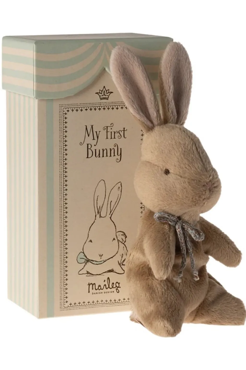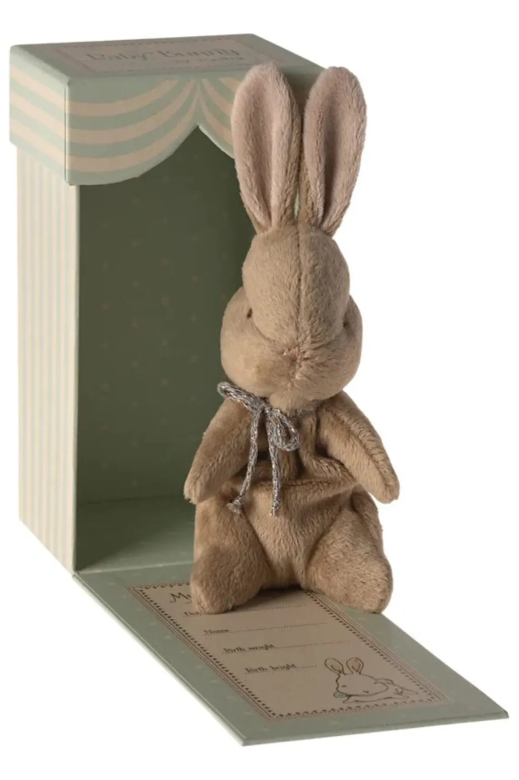 En brun bamsekanin fra Maileg i blødt plys. Den leveres i en gaveæske med plads til at skrive fødselsoplysninger. Et bånd om halsen giver kaninen et personligt præg.