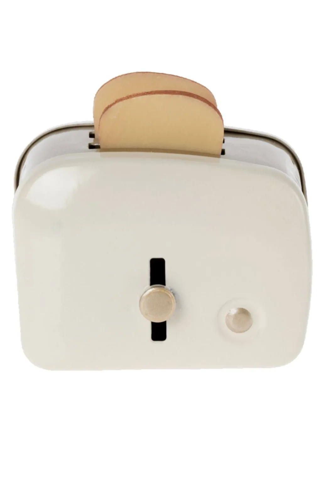 Miniaturetoaster fra Maileg i metal med to skiver brød. Den off-white farve og de detaljerede udformninger gør den velegnet til leg med dukker og miniaturemøbler.