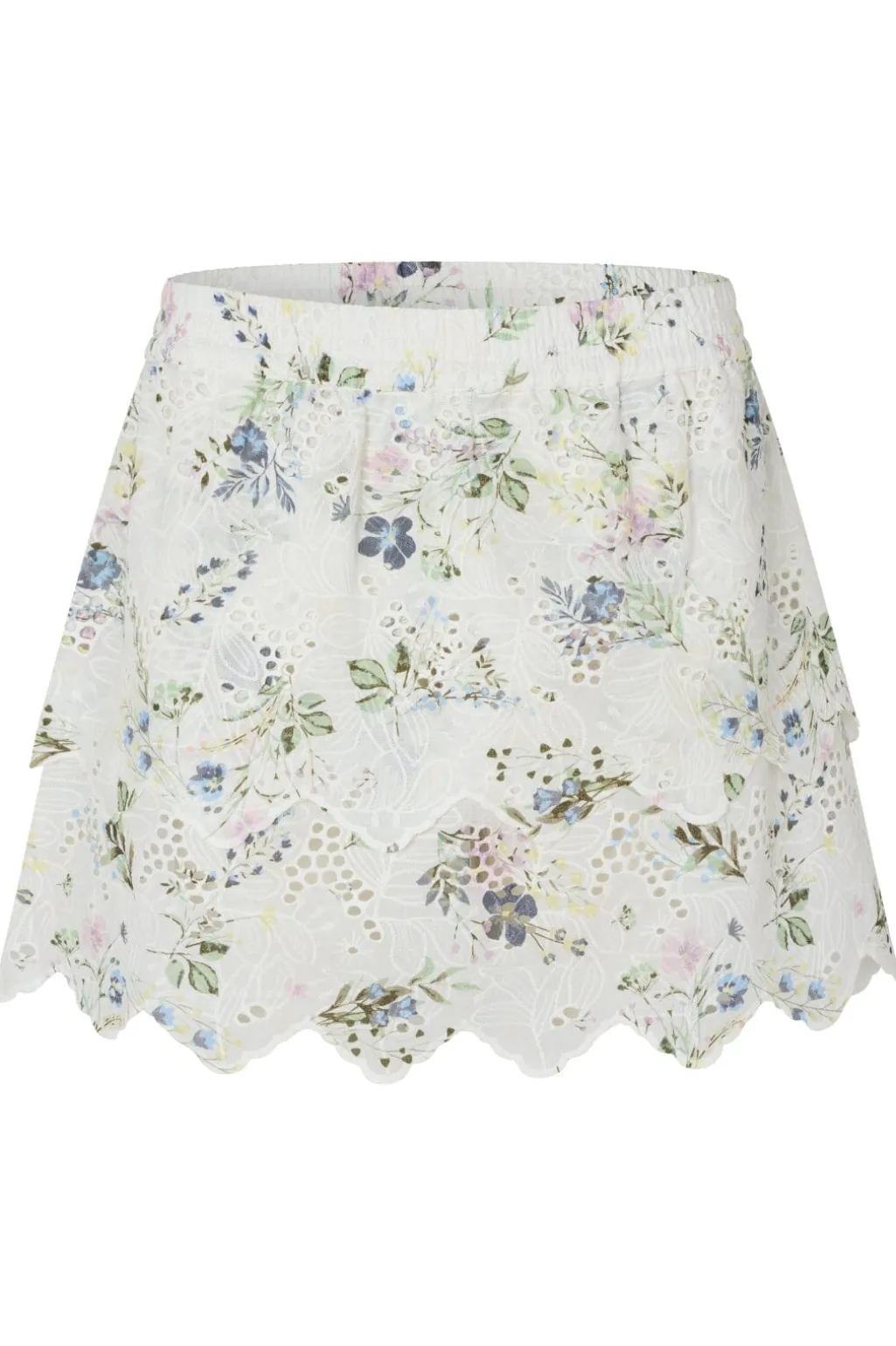 Hvid nederdel fra MbyM med et blomstret mønster i blå, pink og grønne nuancer. Nederdelen har et lagdelt design med bølgede kanter og broderi.