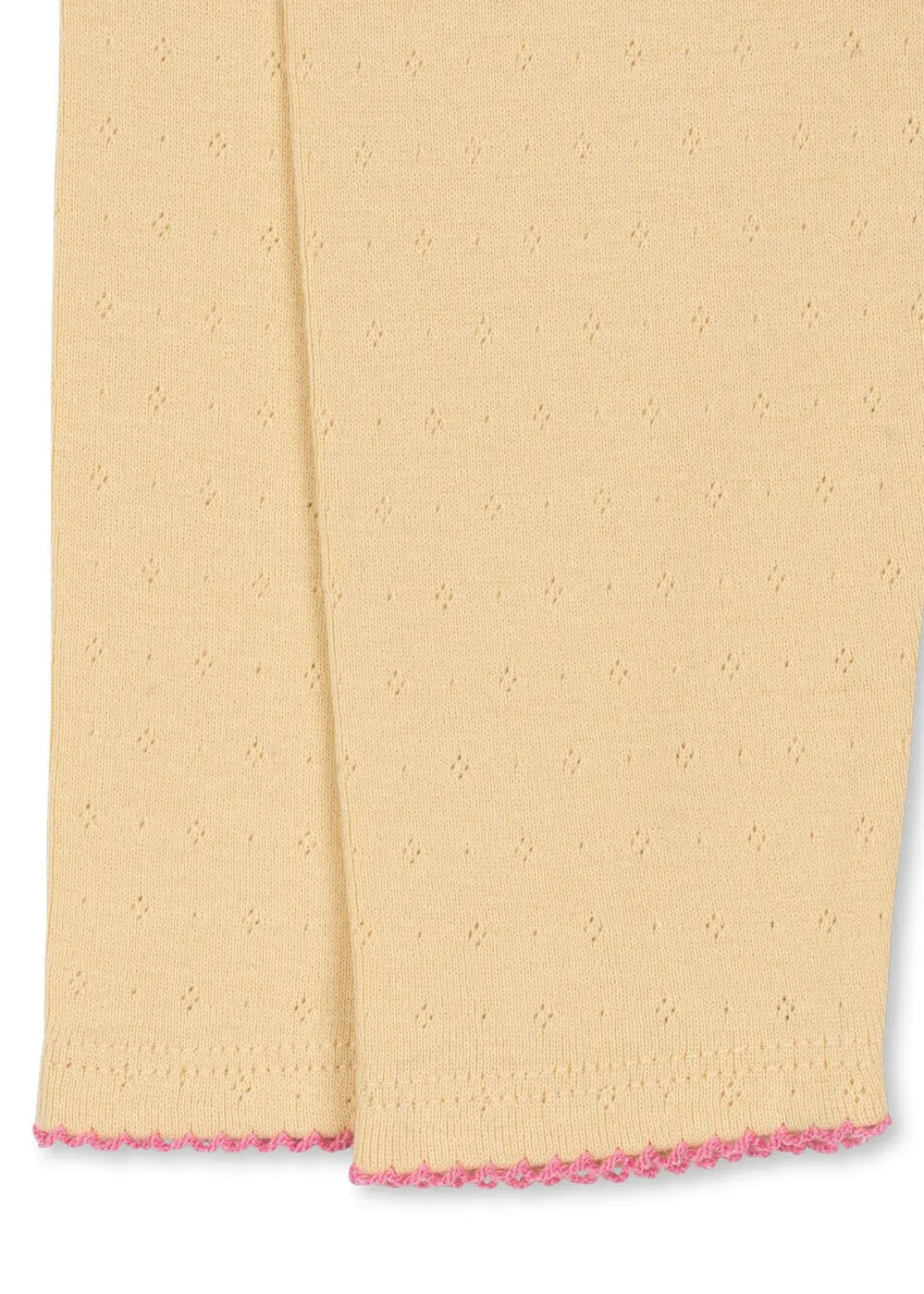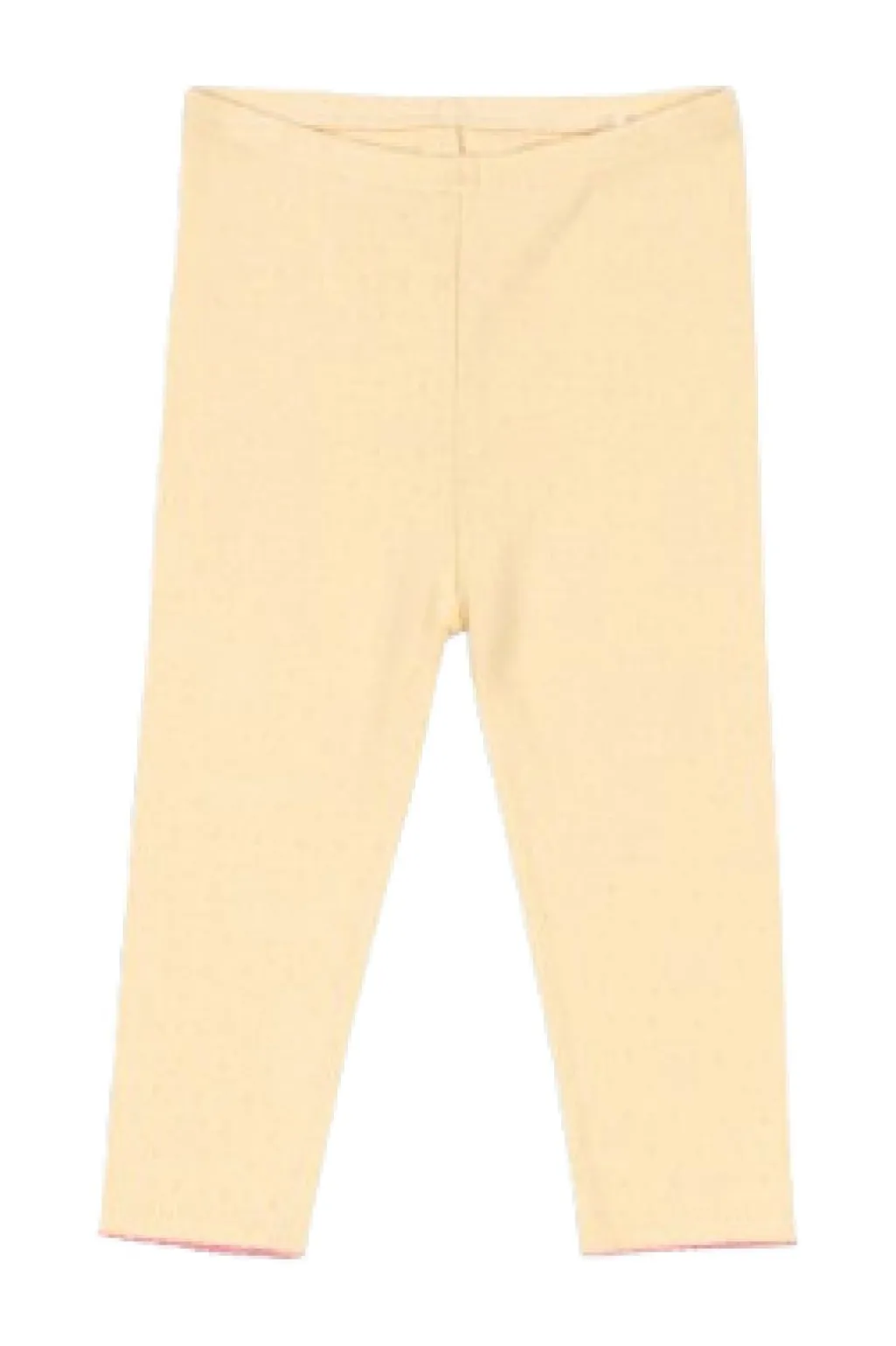 Bukser fra Konges Sløjd i en gylden farve. De har en elastisk talje og er fremstillet af økologisk bomuld med en dekorativ pink kant nederst på benene.