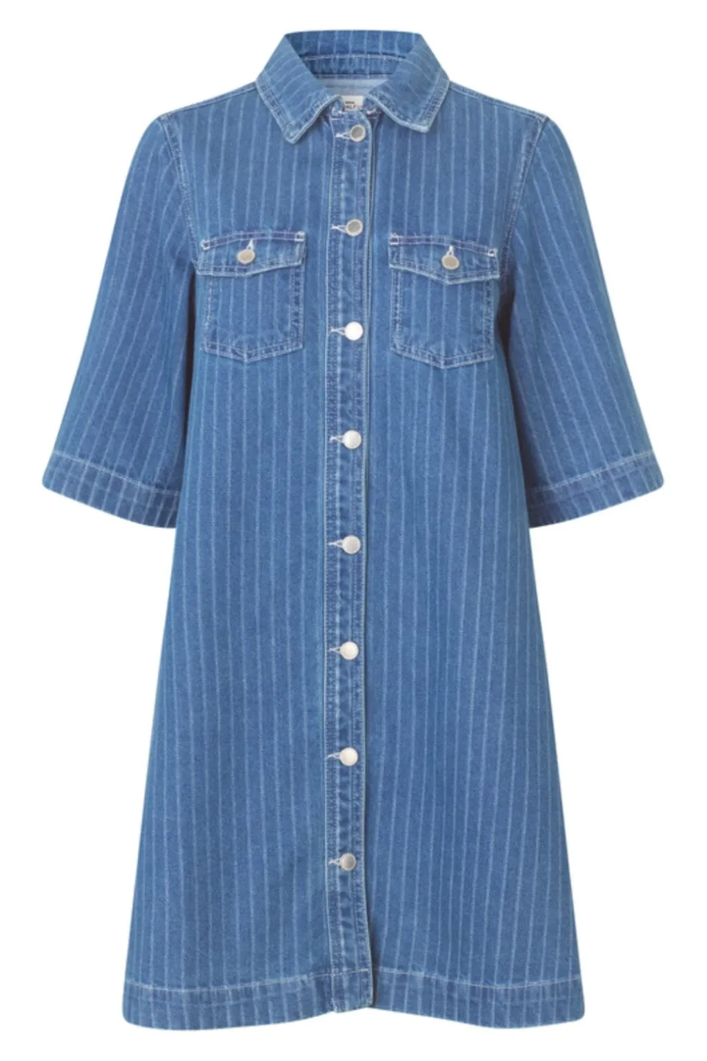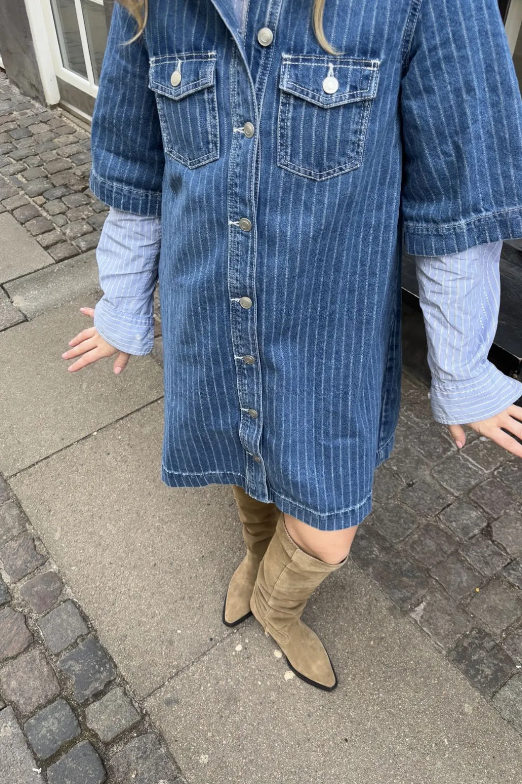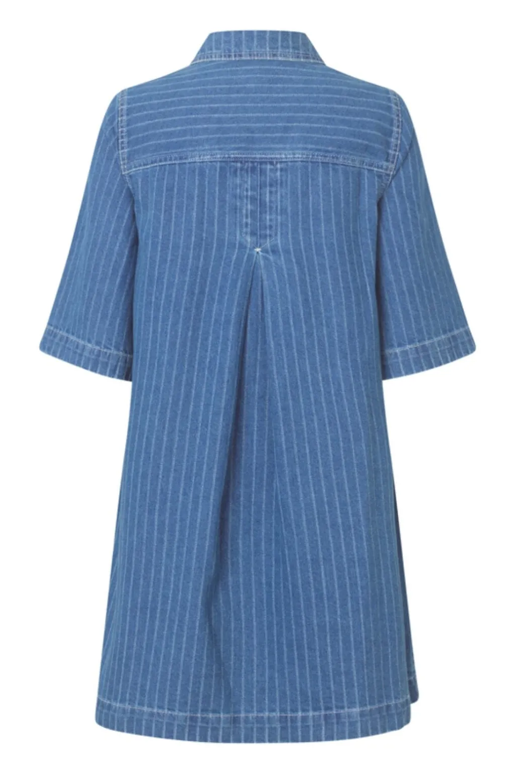 Denimkjole fra Global Funk i midtblå med lodrette striber. Kjolen har skjortekrave, knaplukning foran og to brystlommer. Længden går til låret, og ærmerne er 3/4-lange.