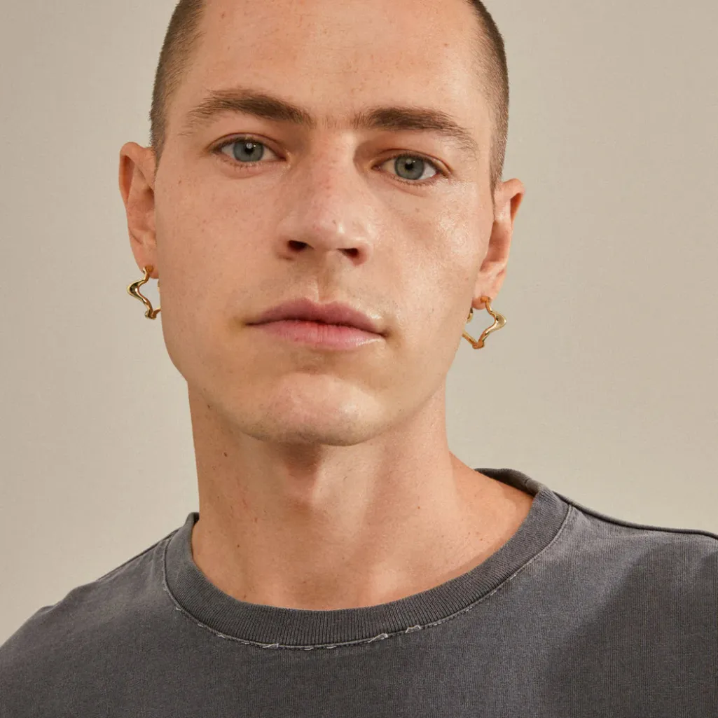 Gyldne øreringe fra Pilgrim med et bølget, skulpturelt design. Øreringene er fremstillet af genanvendt messing med en blank guldbelægning, der fremhæver det organiske formsprog.