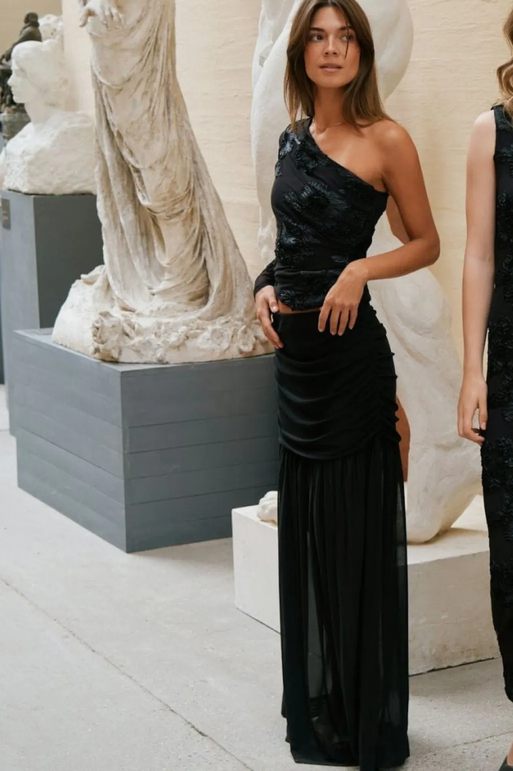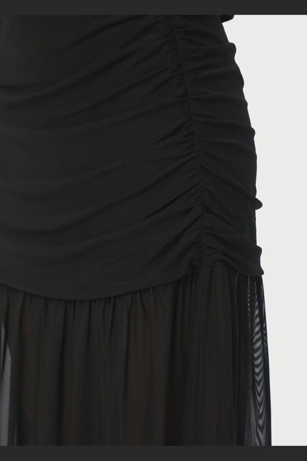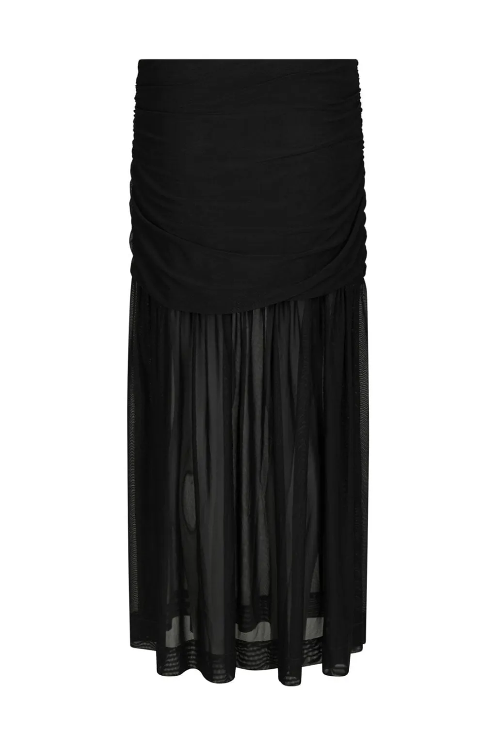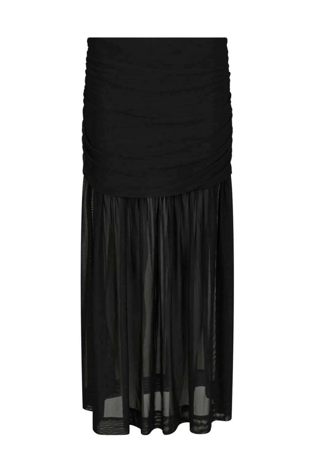 Sort nederdel fra Neo Noir med lagdelt design. Den øverste del har foring og sidder tæt til kroppen, mens den nederste del er gennemsigtig med rynkedetaljer og en vid pasform.