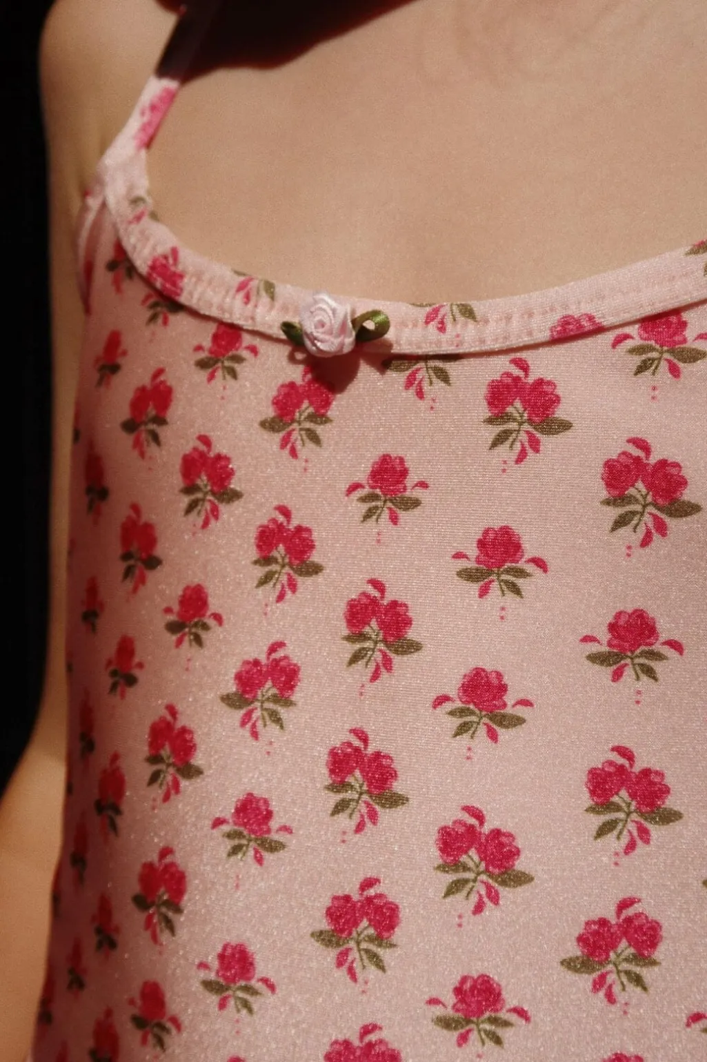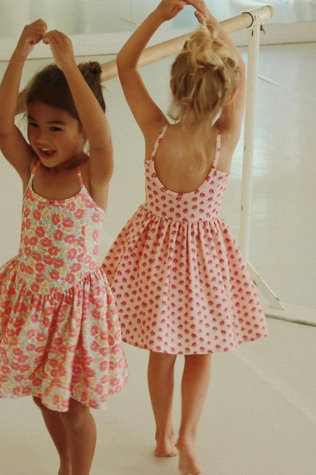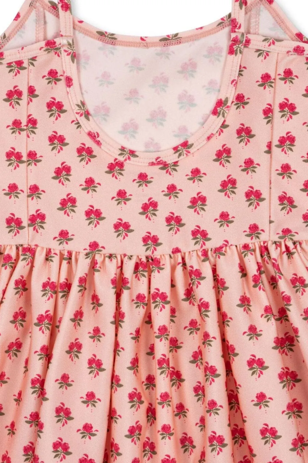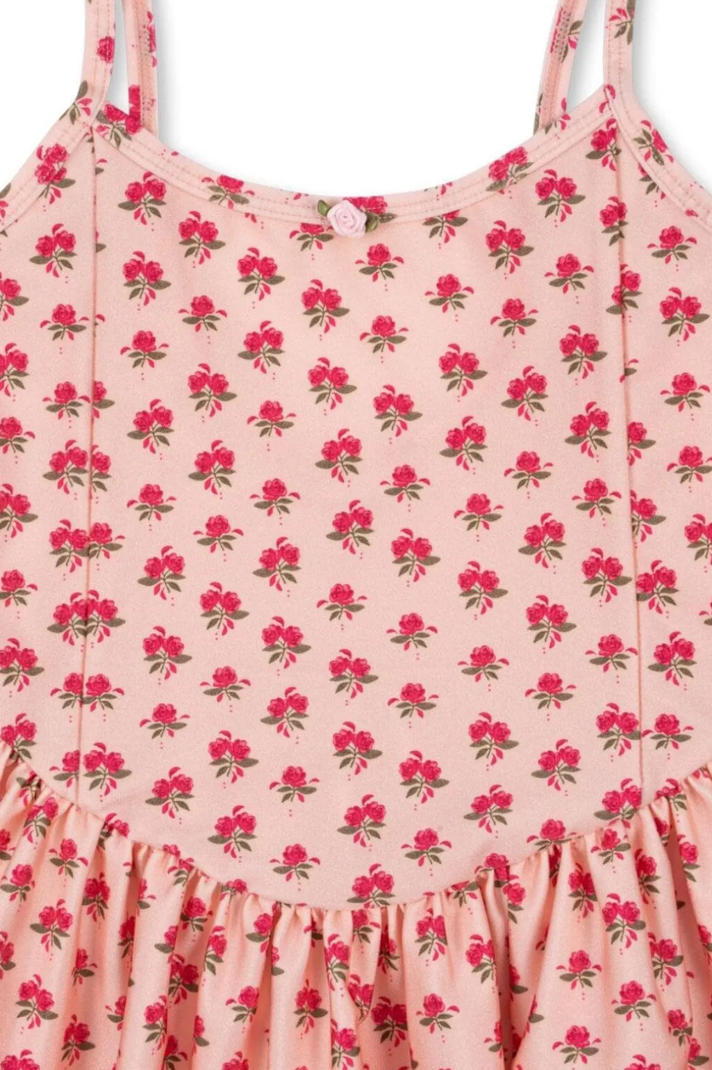 Kjole fra Konges Sløjd med blomsterprint i pink nuancer. De tynde stropper kan justeres, og kjolen har flæsedetaljer samt rund halsudskæring.