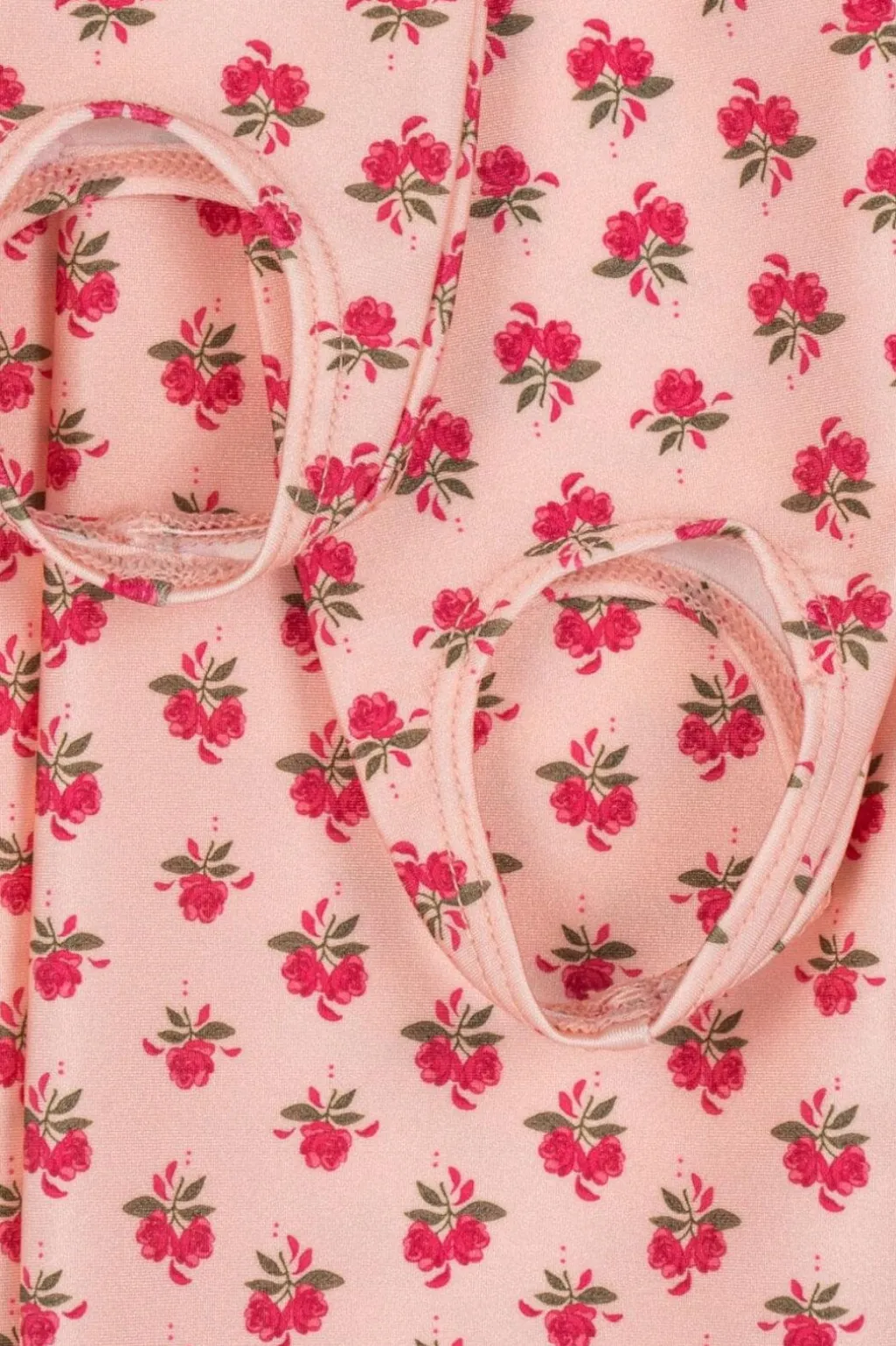 Lange leggings fra Konges Sløjd med små røde roser på lyserød baggrund. De har fodstropper og elastisk talje for god pasform under bevægelse.