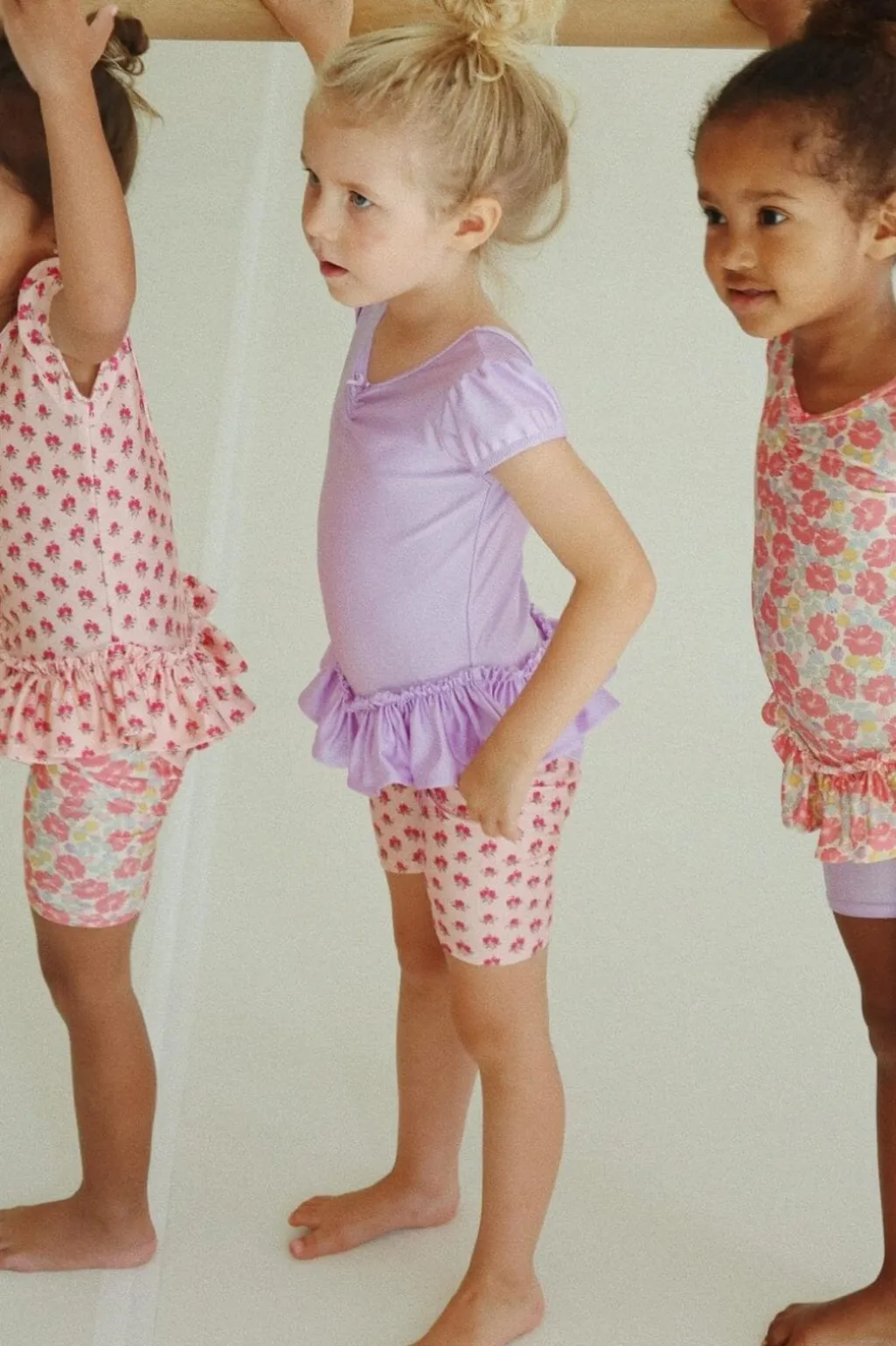 Det lyserøde stof har et fint rosemønster og flæsekanter, der giver leggingsene et sommerligt udtryk.