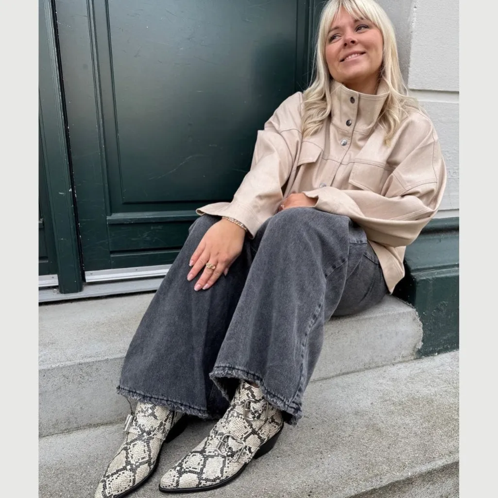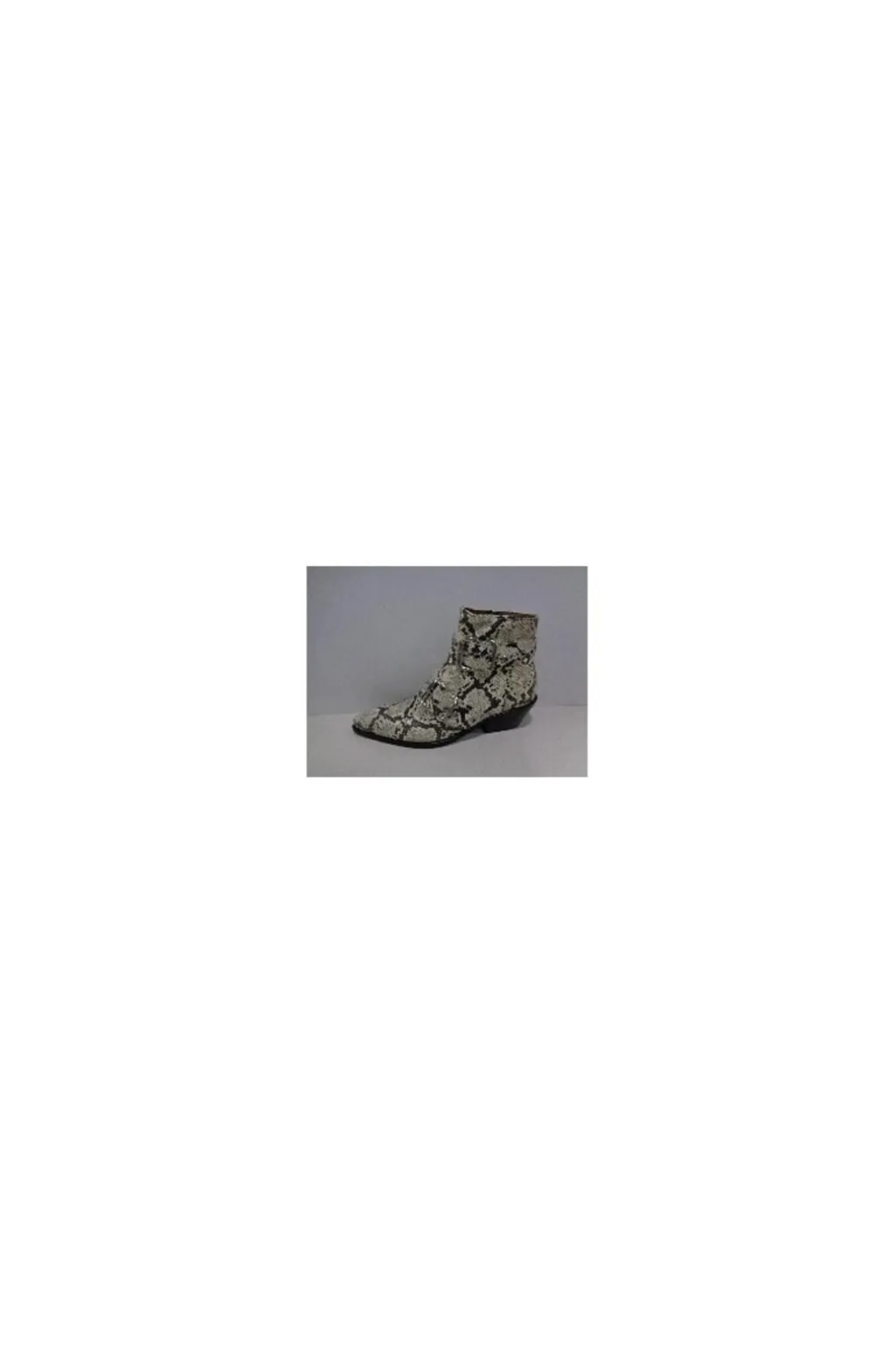 Ankelstøvle fra Copenhagen Shoes i sort og off-white ruskind med slangeskindsprint. Støvlen har spids tå og to sølvspænder på ydersiden.