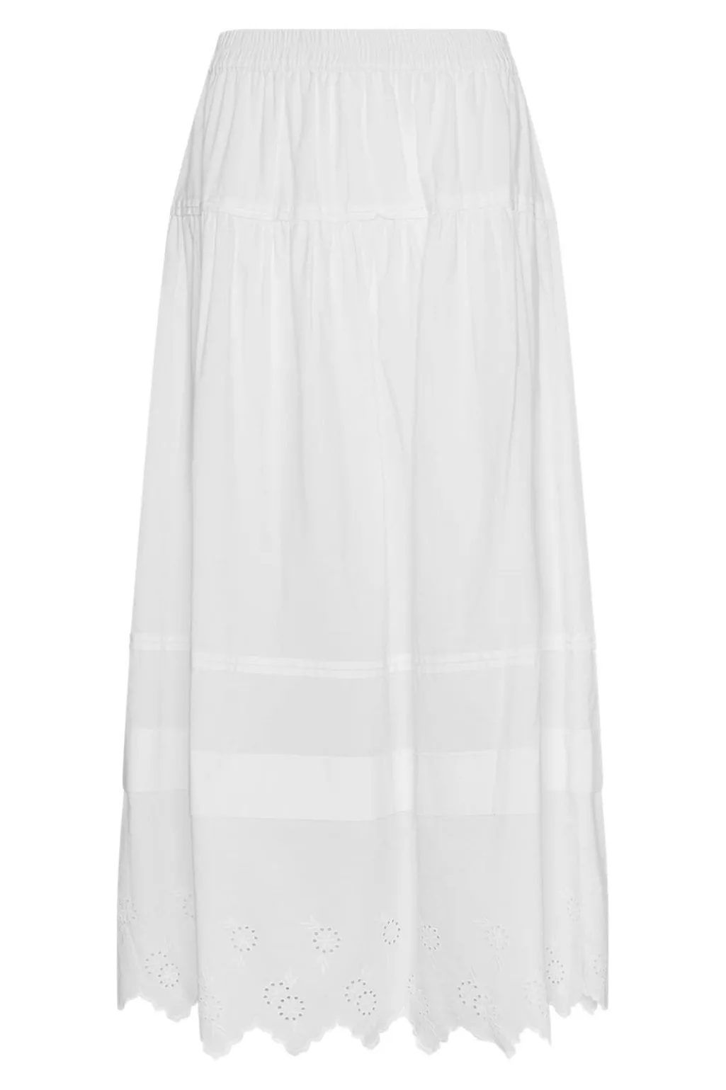 En hvid nederdel i let bomuld med broderede detaljer og flæser langs kanten. Den har en elastisk talje og går til midt på læggen.