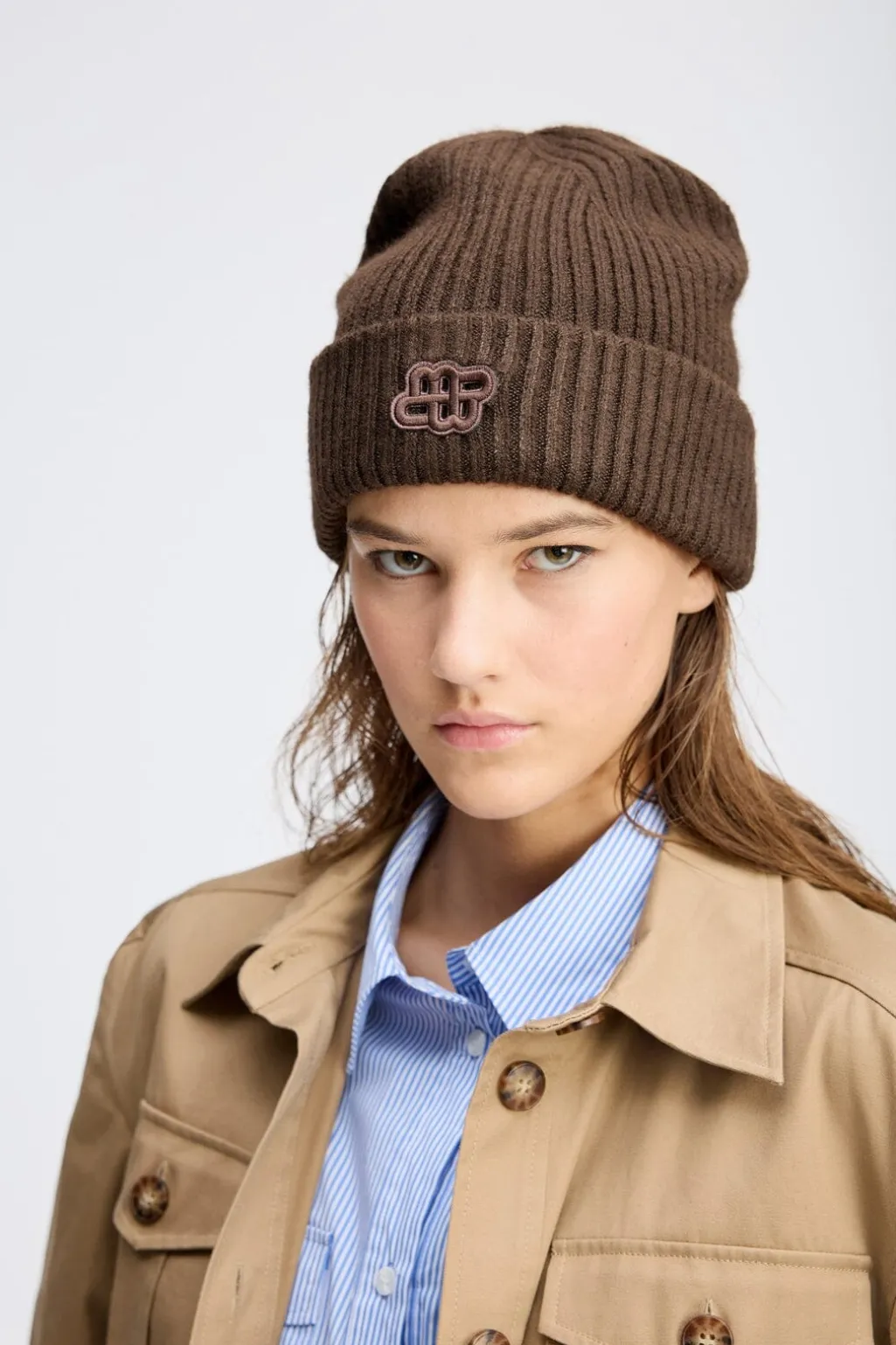Brun hue fra Munthe med ribstrikket tekstur. Den har opsmøg i kanten og et broderet logo i samme farve som huen. Strikket i en blanding af genanvendt polyester og elastan.