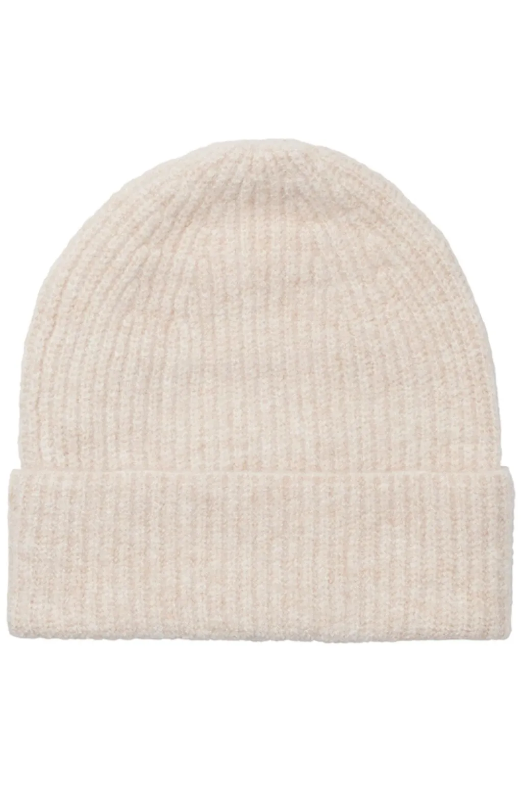 Ribbet hue fra MbyM i en lys beige meleret farve. Huen har en snug pasform og dækker delvist ørerne.