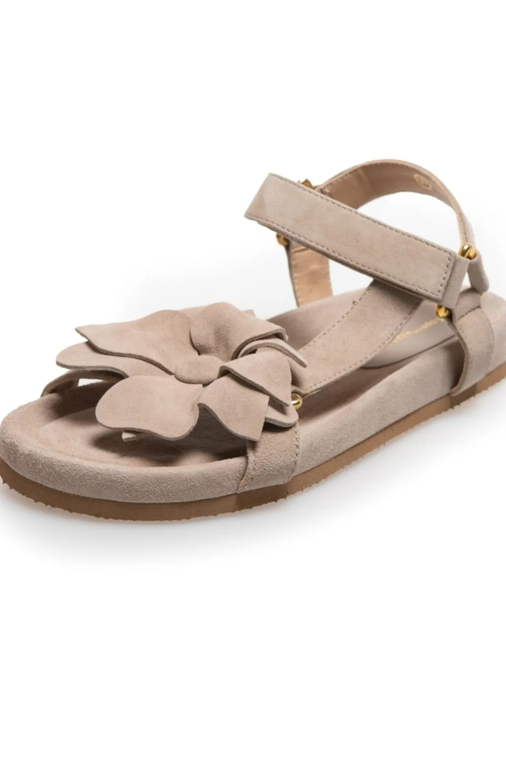 Sandal fra Copenhagen Shoes i biscuitfarvet ruskind. En åben model med en stor blomsterdekoration på remmen og velcrolukning, der gør den nem at tage af og på.