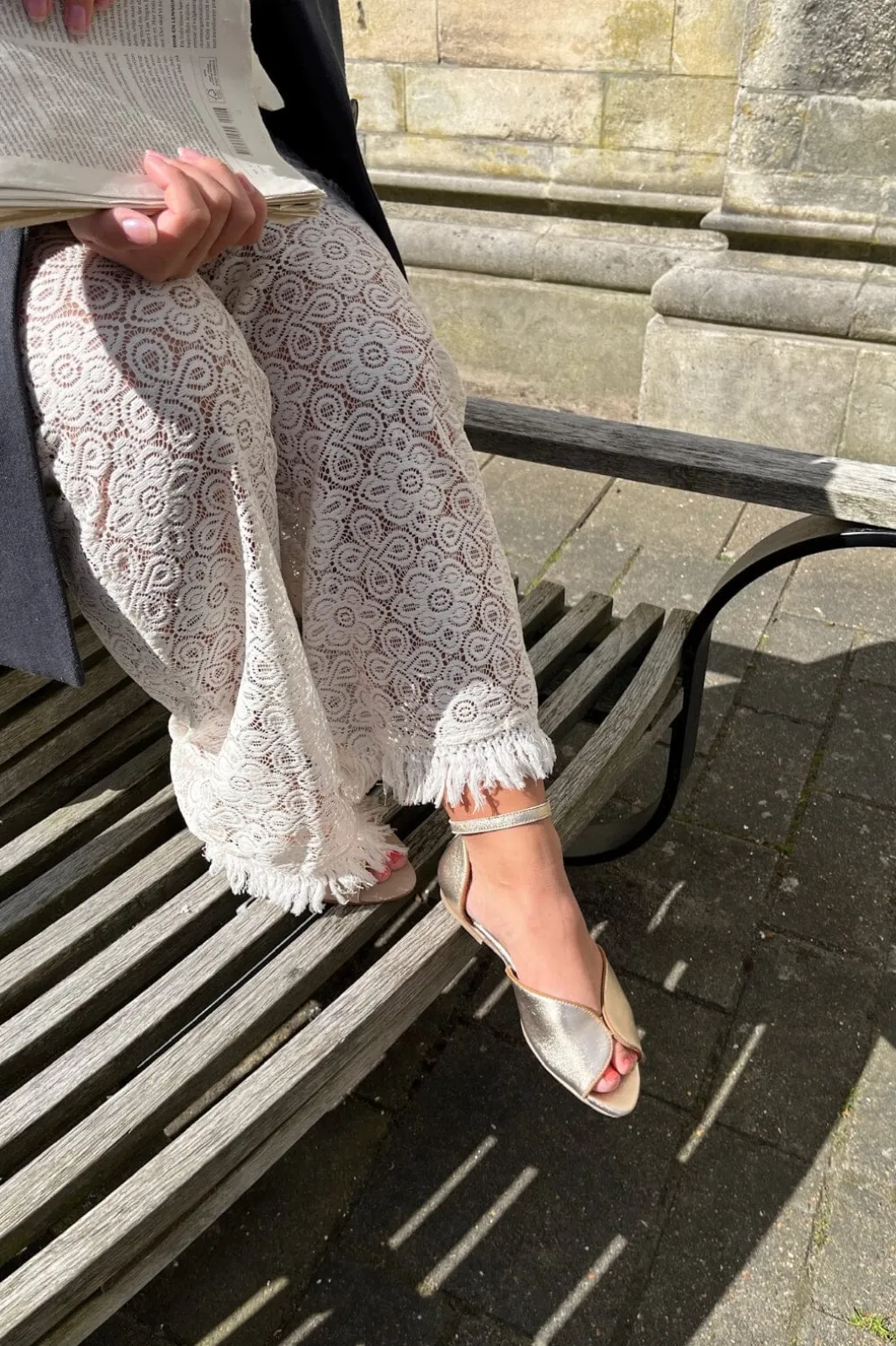 Guldfarvet sandal fra Copenhagen Shoes med åben tå og ankelrem. Skoene har en metallisk overflade og er lavet af læder med lav hæl.