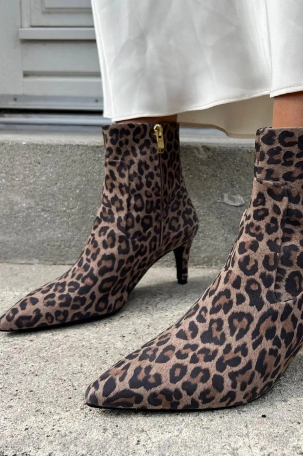 Ankelstøvler fra Copenhagen Shoes i ruskind med leopardprint. Støvlen har spids tå, lynlås på indersiden og en 5-8 cm høj stilethæl.