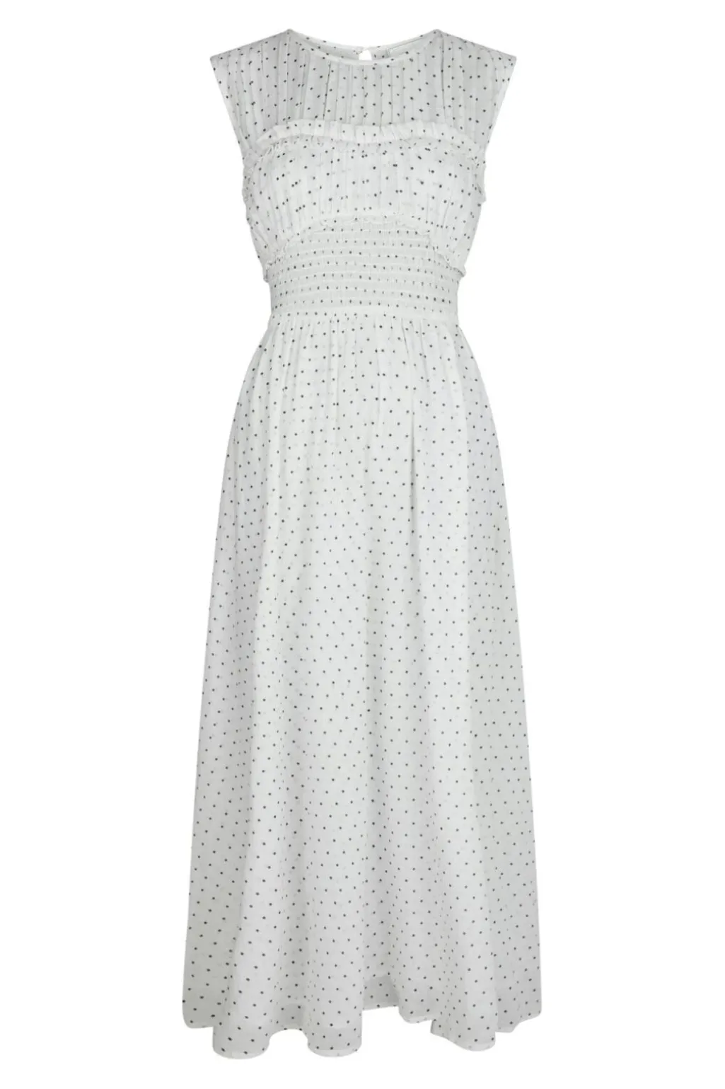 Hvid kjole fra Neo Noir med sorte prikker. Kjolen har smockede detaljer ved taljen og rynker på overdelen. Den ærmeløse model går til anklerne og har en rund halsudskæring.