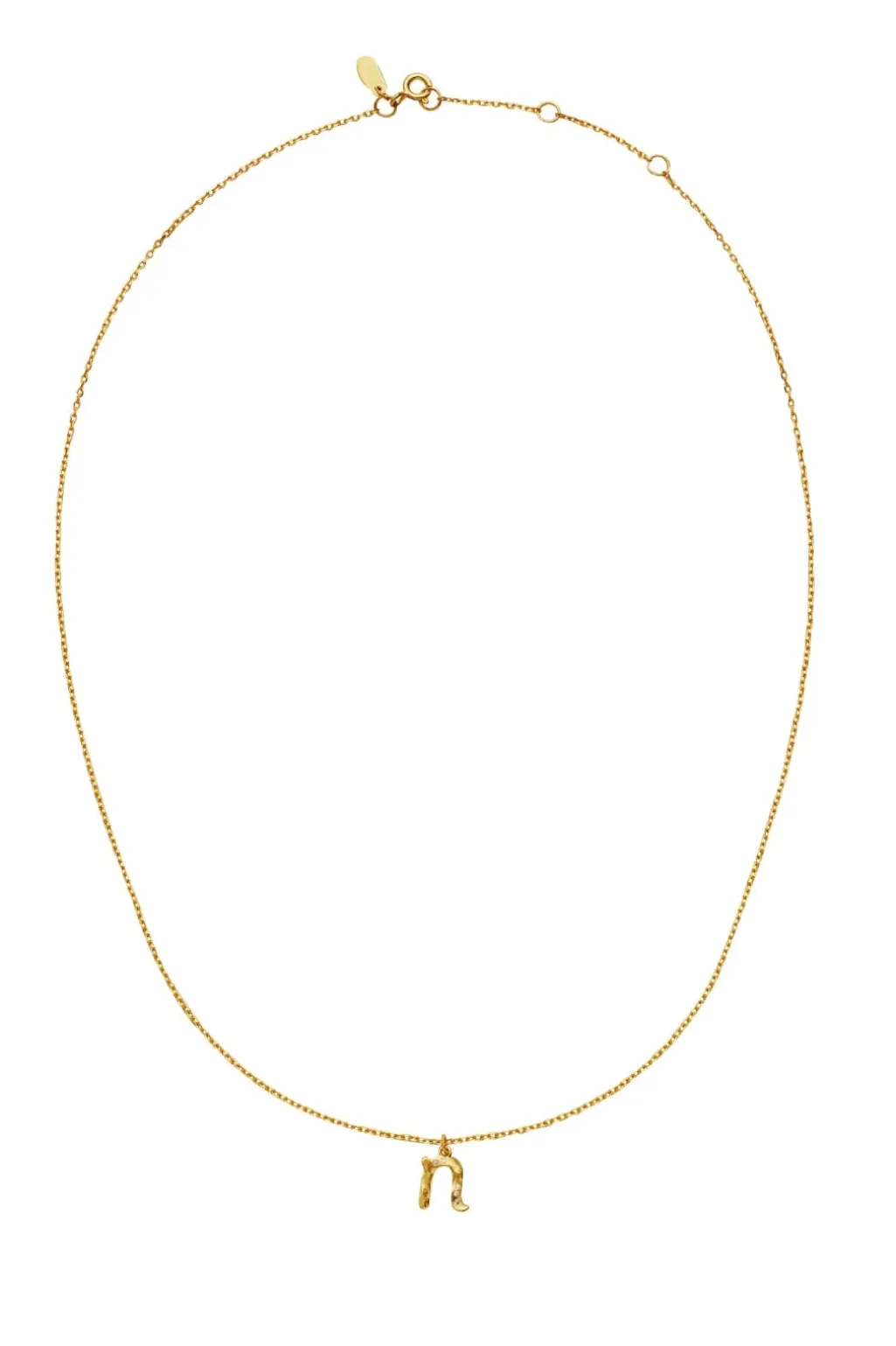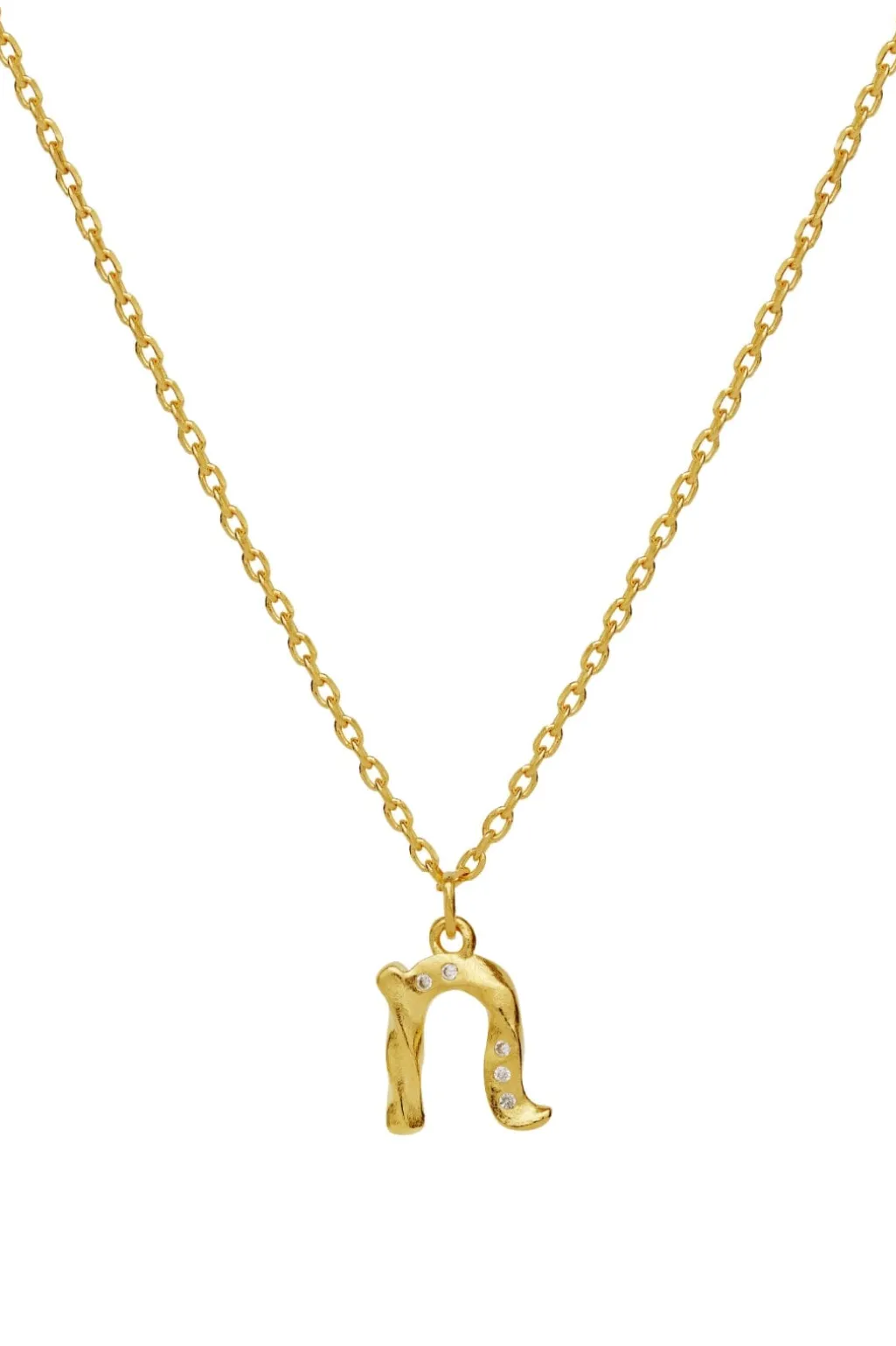 Guldhalskæde fra Maanesten med et n vedhæng udsmykket med små sten. Halskæden er lavet af genanvendt sterlingsølv med 18 karat guldbelægning.