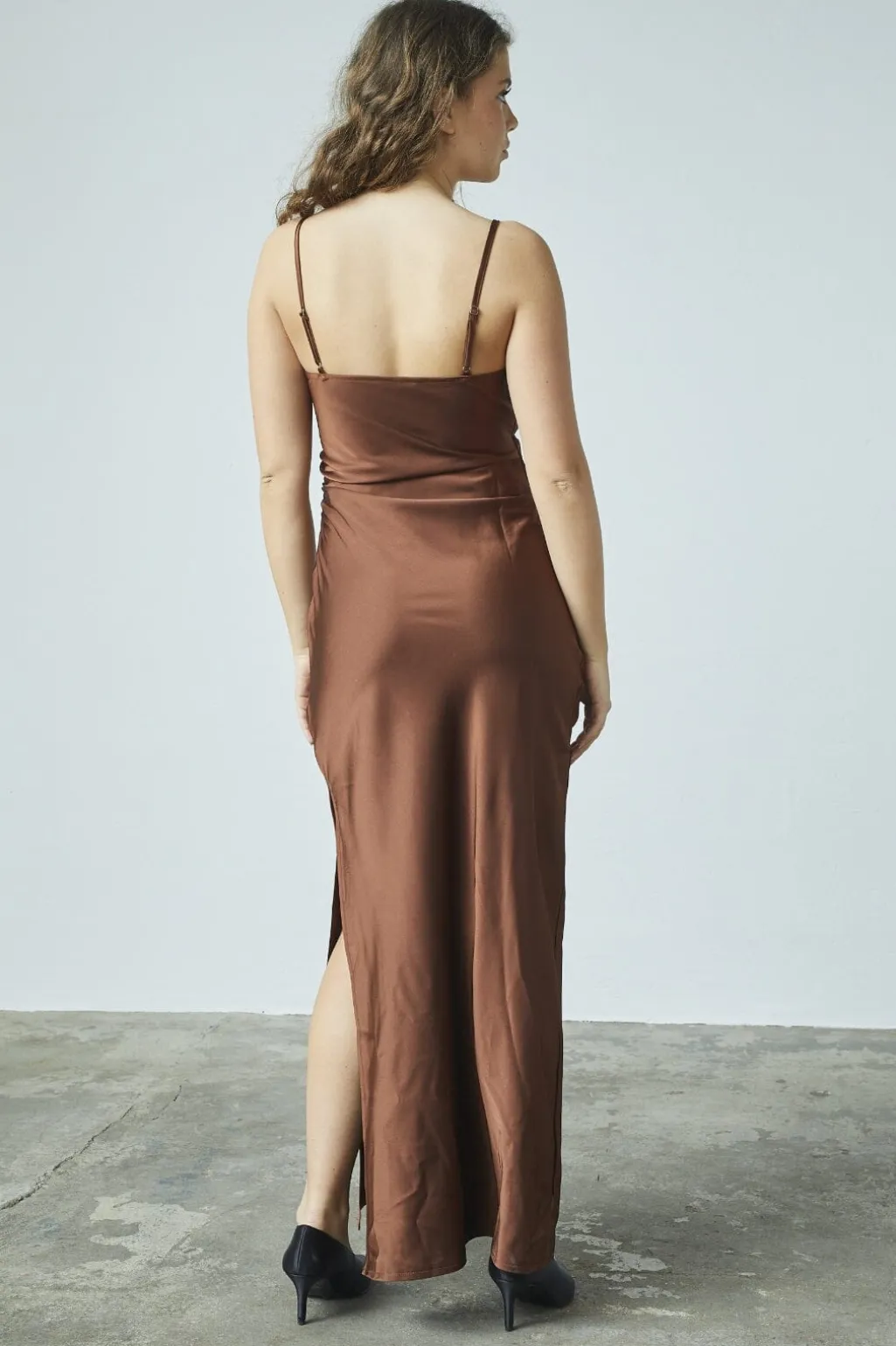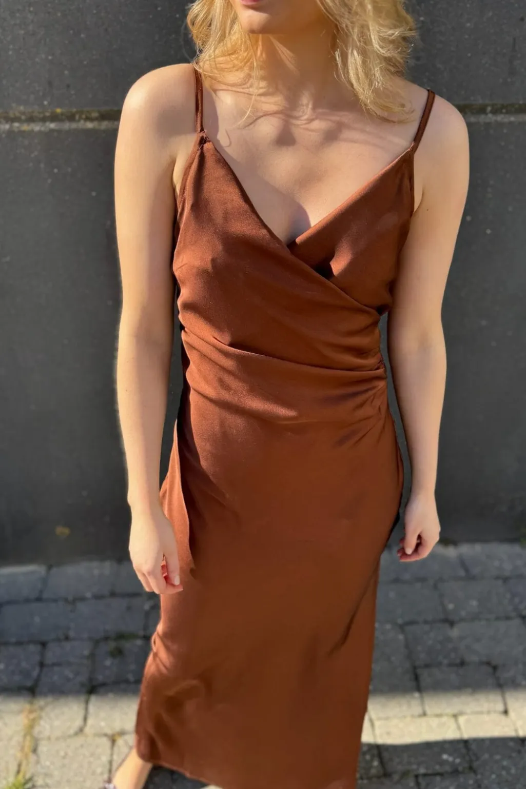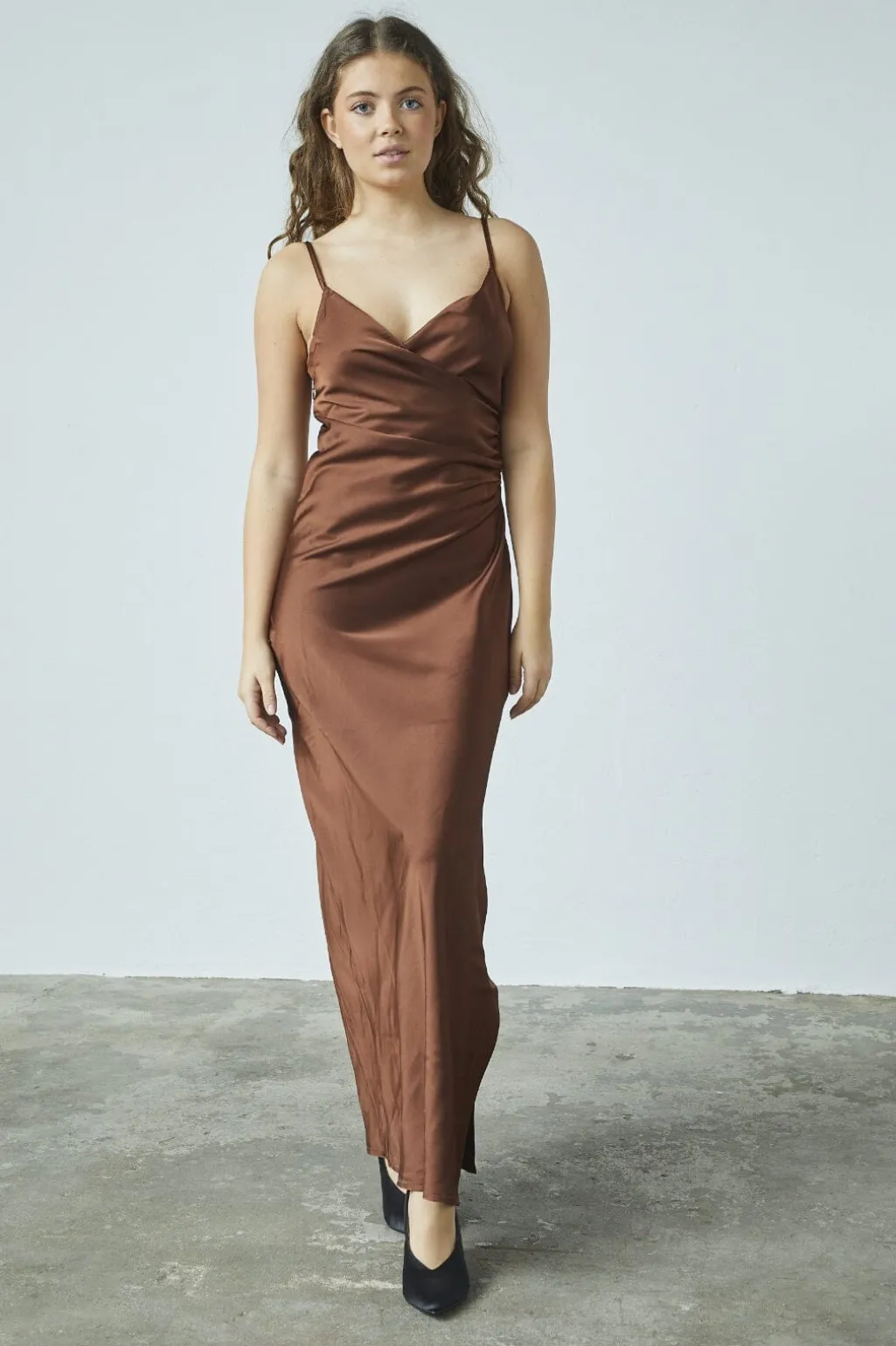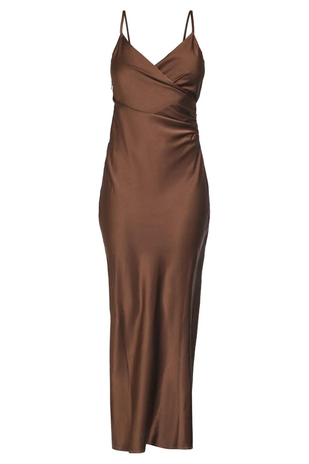 Lang kjole fra Sisters Point i chokoladebrun. Kjolen har et wrap-design med V-udskæring og tynde stropper. Den kropsformende silhuet og slidsen i siden giver god bevægelighed.