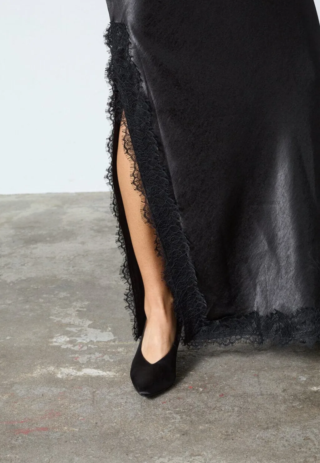 Sort kjole fra Sisters Point til festlige og formelle lejligheder. Kjolen har et satinlook med blonder og en smal pasform.