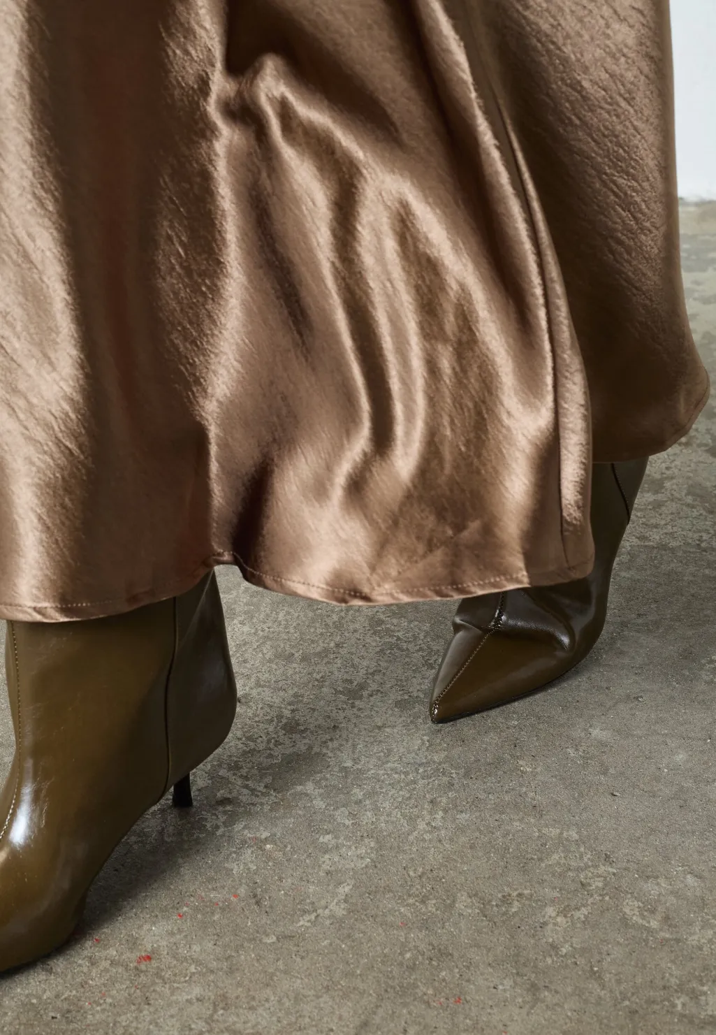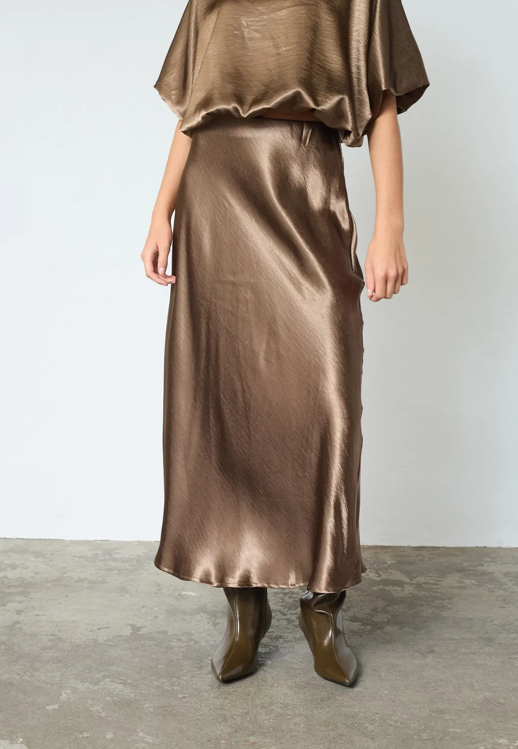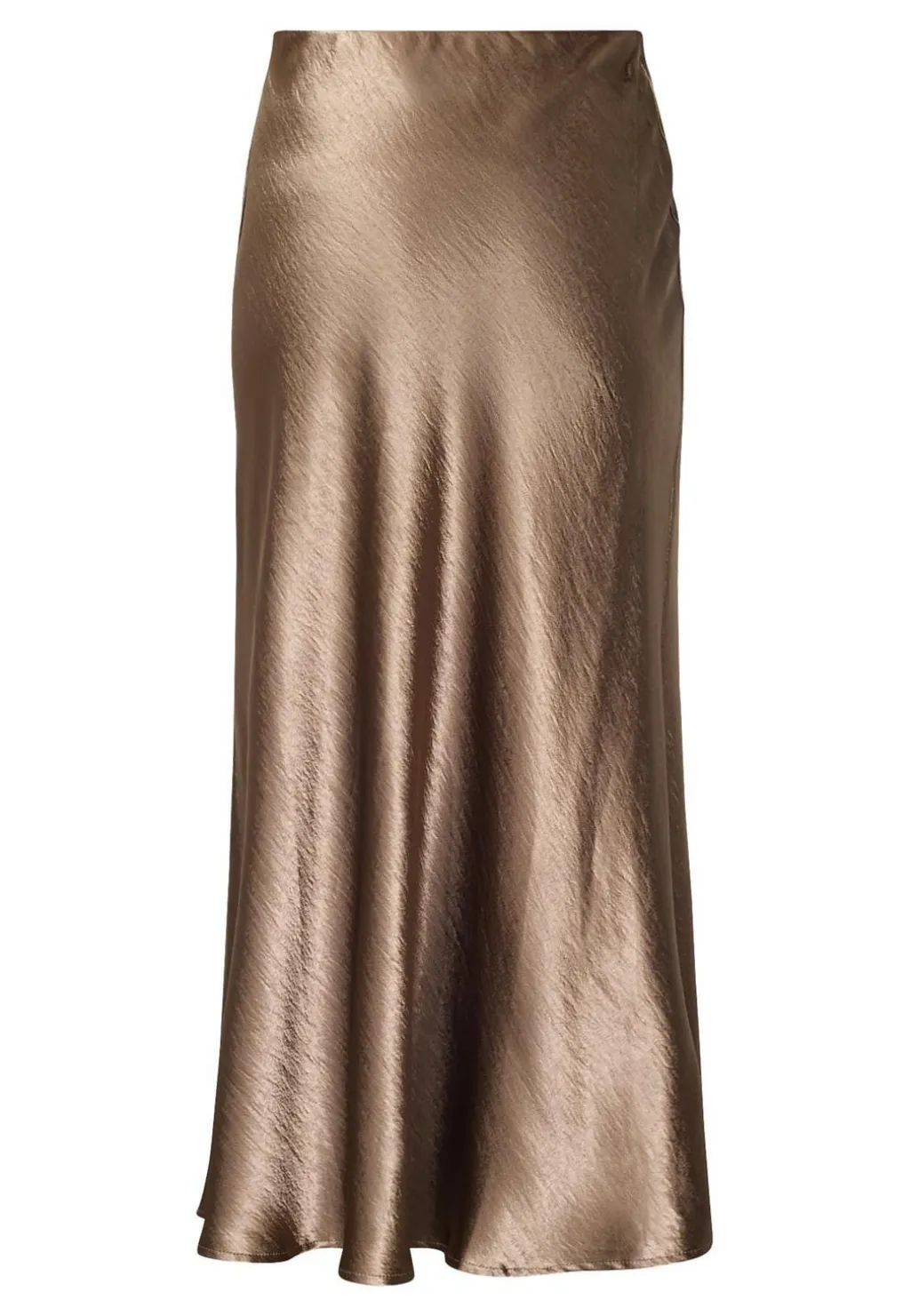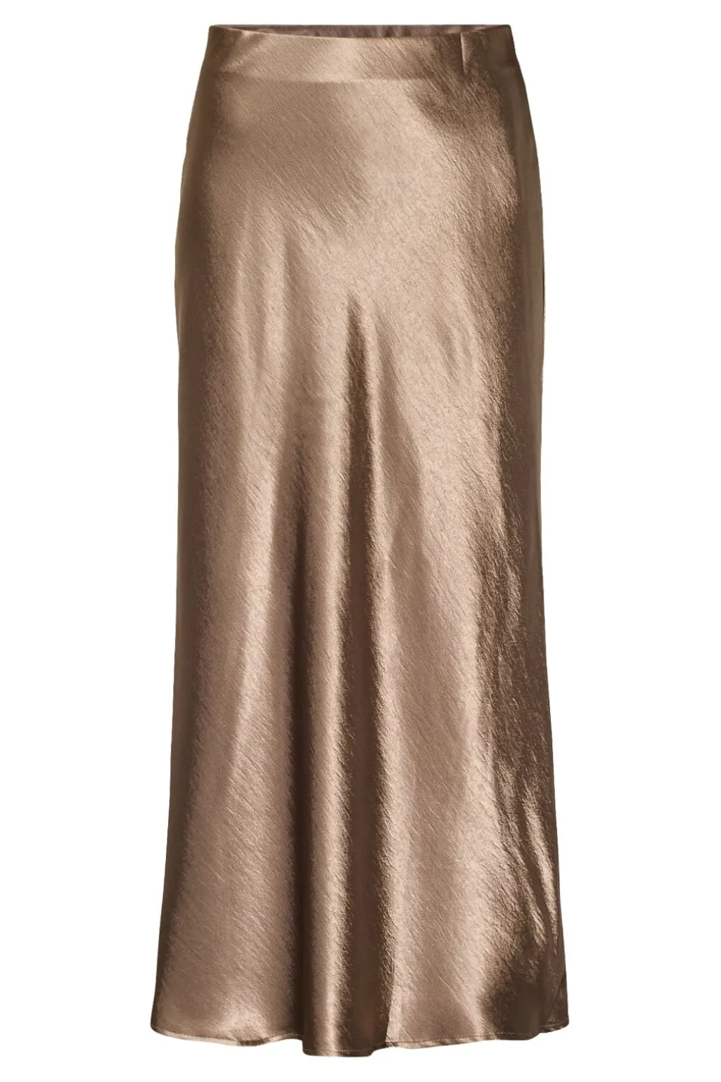 Satinnederdel fra Sisters Point i en jordfarvet nuance med brune og gyldne toner. Nederdelen har en A-line-facon og en glat, skinnende overflade.