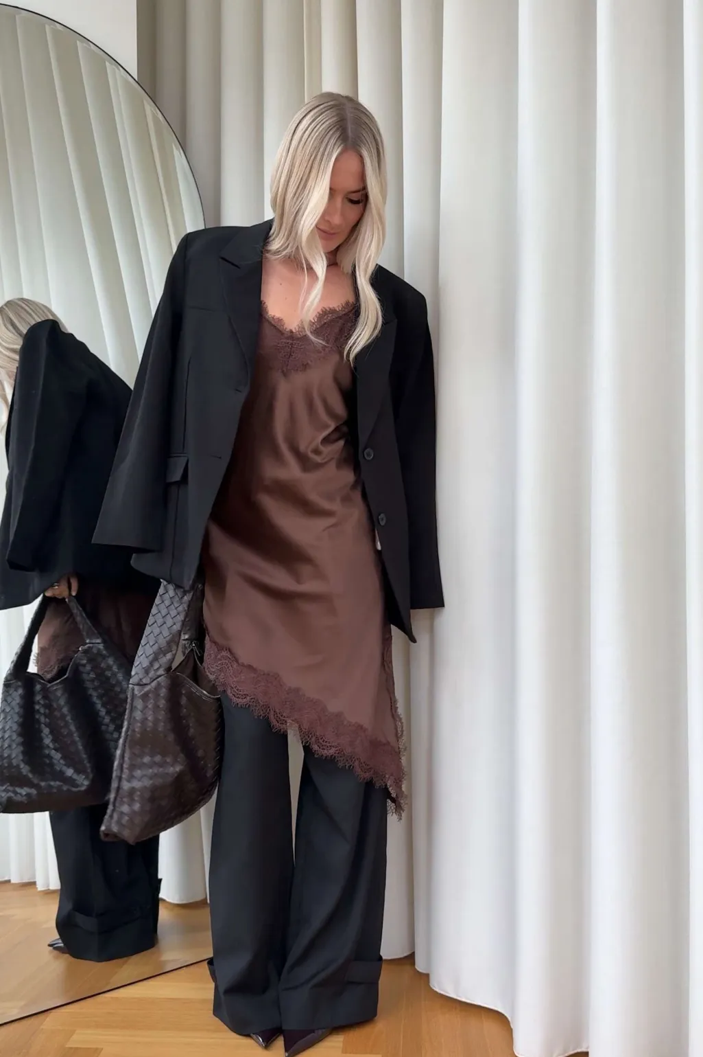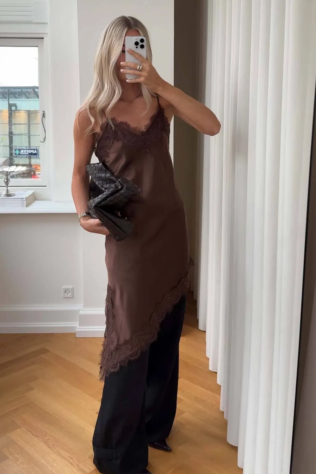 Brun satinkjole fra Noella med blonder ved halsudskæringen og kanten. Kjolen har justerbare, tynde stropper og en asymmetrisk kant.