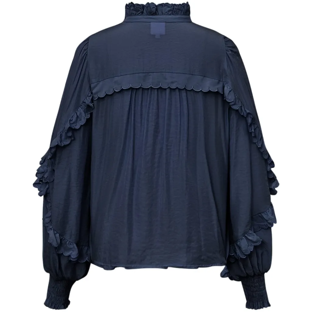 Mørkeblå bluse fra Gossia med flæsedetaljer ved halsen, ærmerne og ryggen. Blusen er lavet af 57 % polyamid og 43 % viskose.