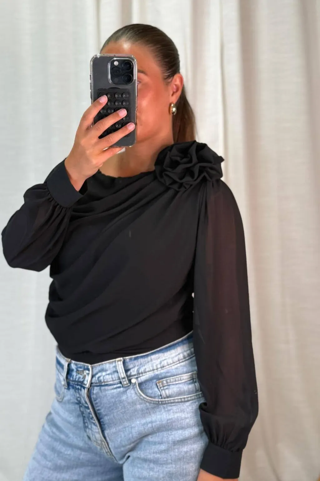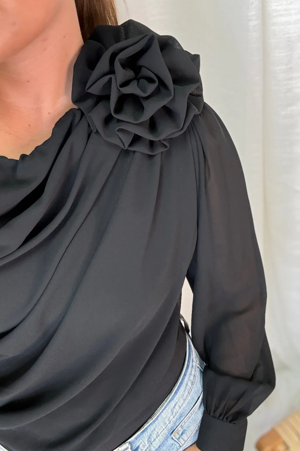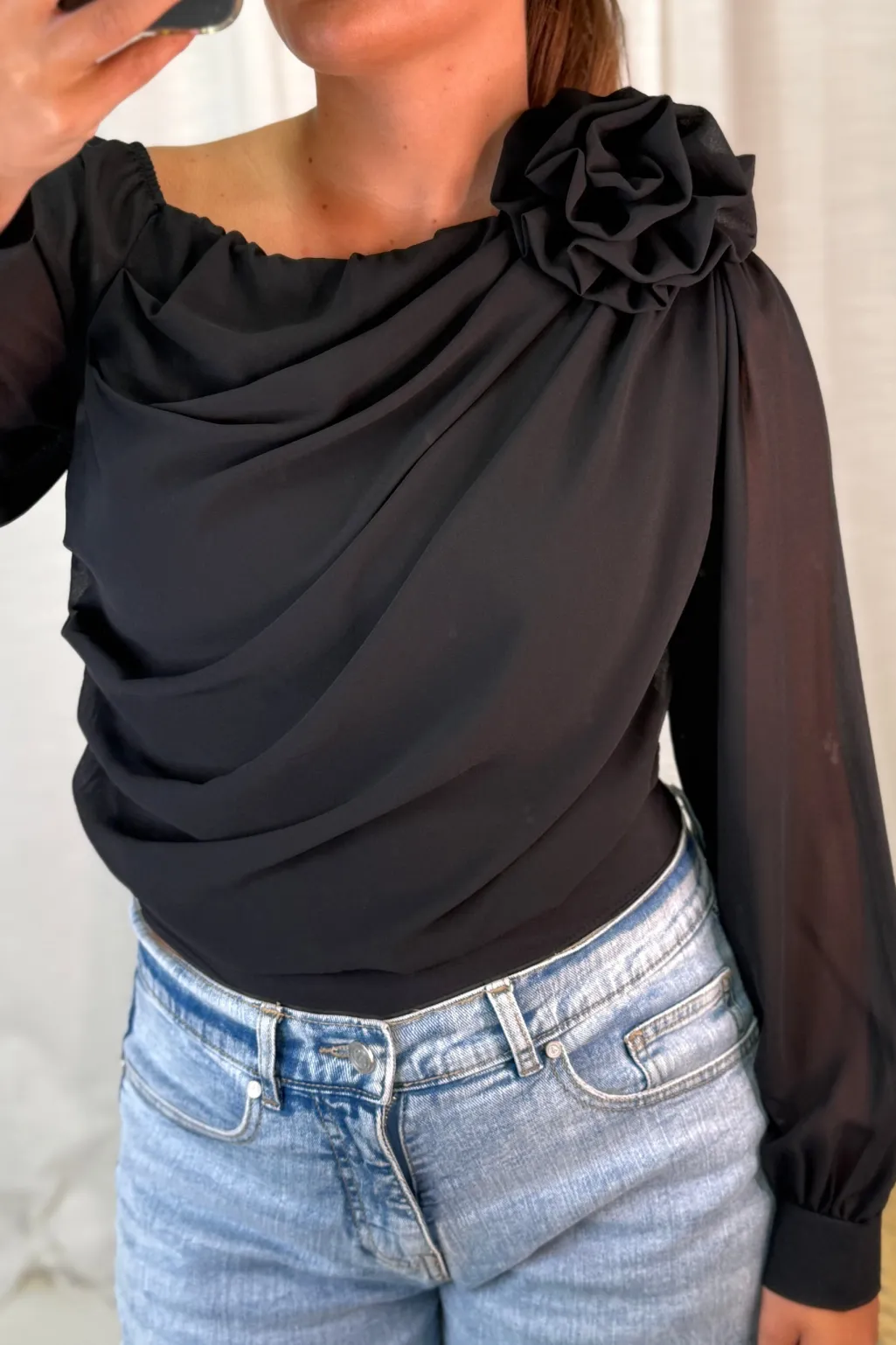 Sort bodystocking fra A-bee med asymmetrisk halsudskæring og draperinger. Den passer til formelle begivenheder og festlige lejligheder.