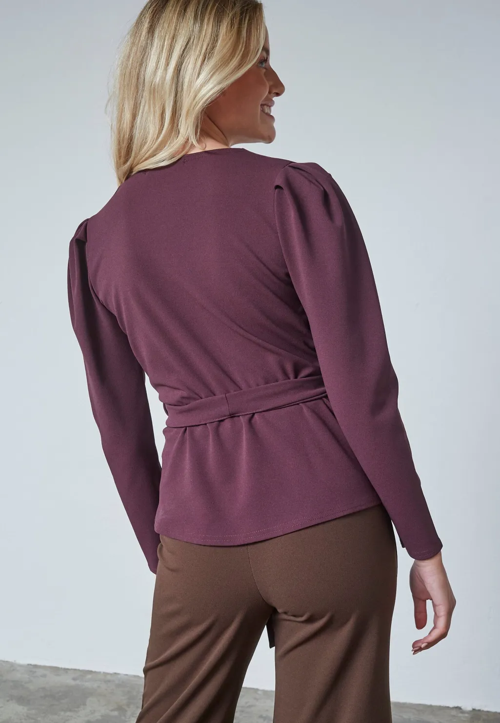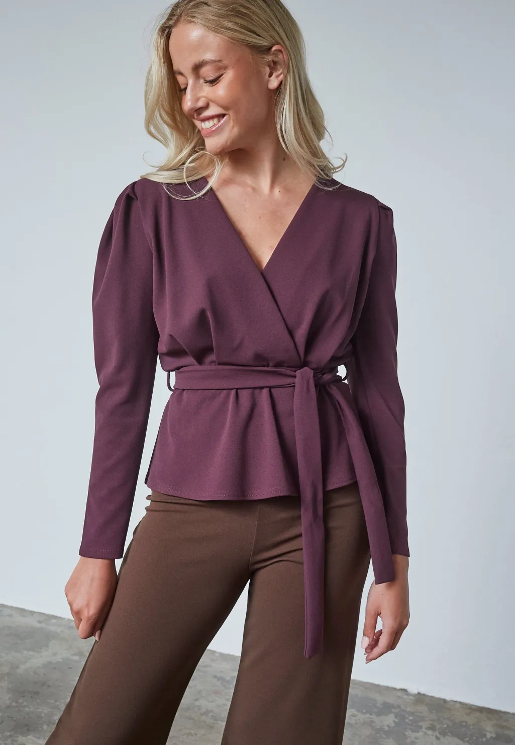 Bluse fra Sisters Point i dyb bordeauxfarve. Blusen har en v-hals og lange ærmer med rynkede detaljer ved skuldrene.
