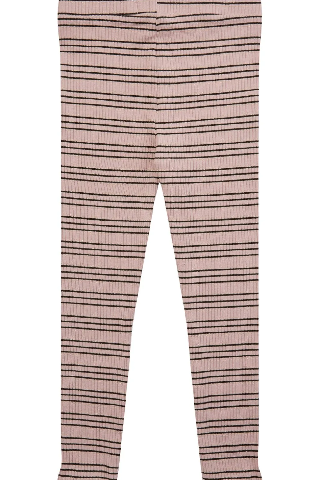 Lyserøde leggings fra Liberté med sorte striber og bølgede kanter i bunden. De har en høj talje og ankellængde, og stoffet har et skinnende lurex-look.