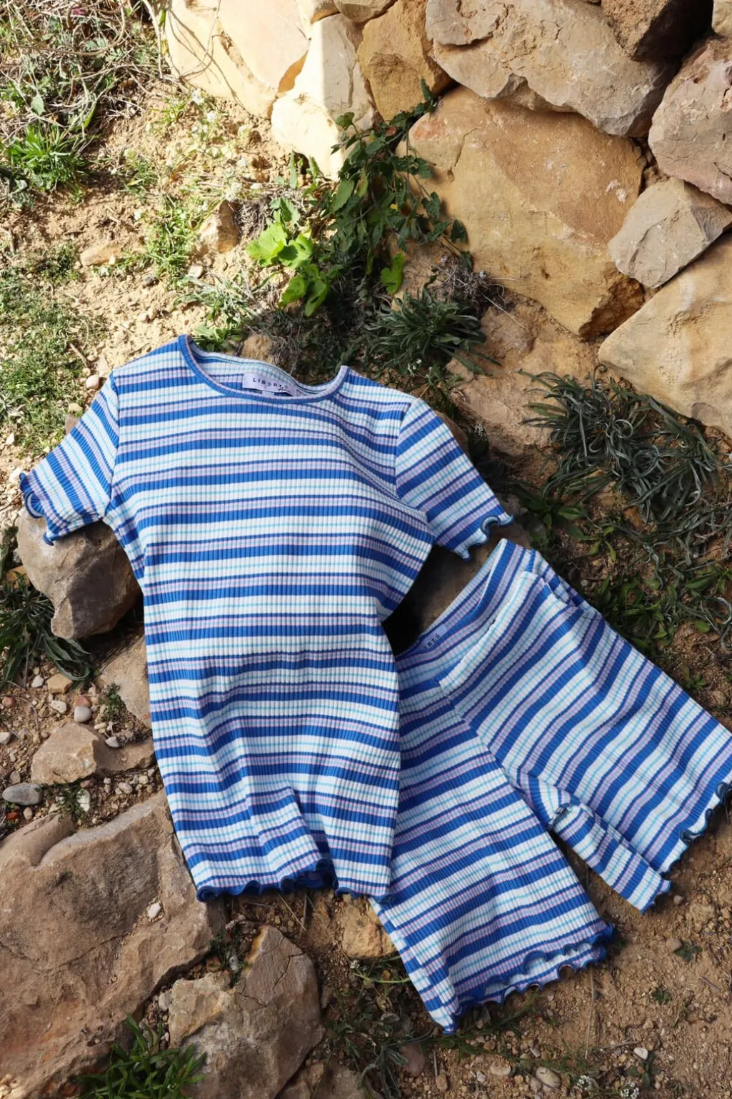 Stribede shorts fra Liberte Ami med blå, hvide og rosa striber. De har bølgede kanter og er lavet i en blød bomuldsblanding med stretch, som giver god bevægelsesfrihed.