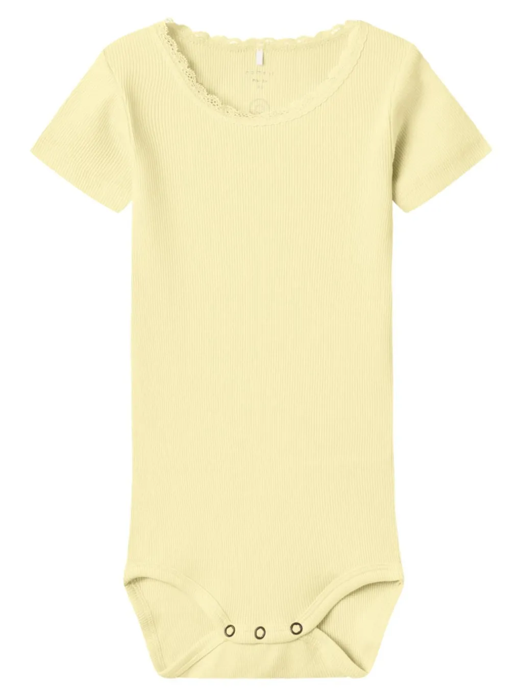 Pastellgul body fra Name It med ribbet tekstur. Den har korte ærmer, rund halsudskæring med blondedetaljer og trykknapper i bunden for nem påklædning.
